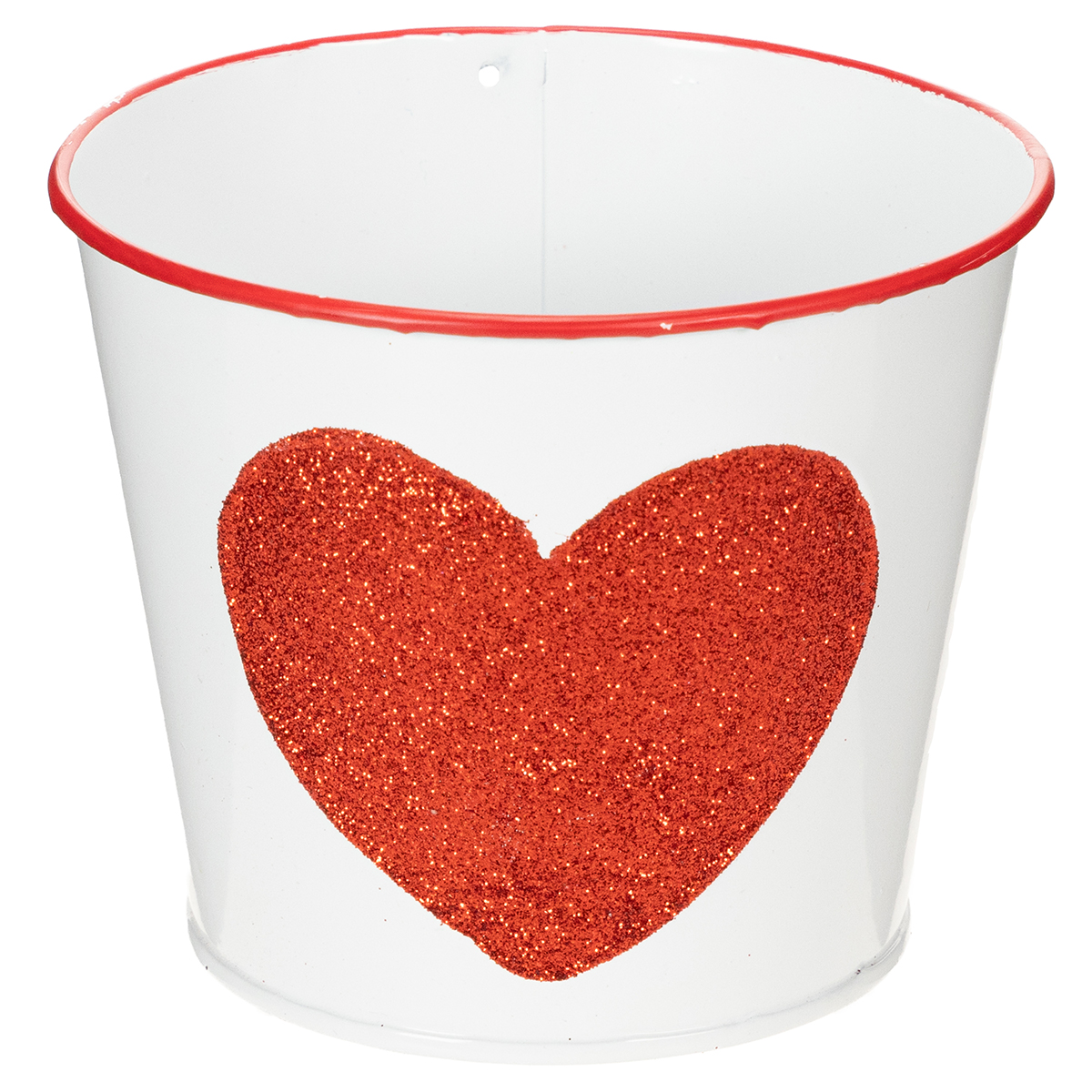 Krásný malý květináč s klasickým designem. Bílé plechové vědro má tvar šálku, má červený okraj a červený tvar srdce.