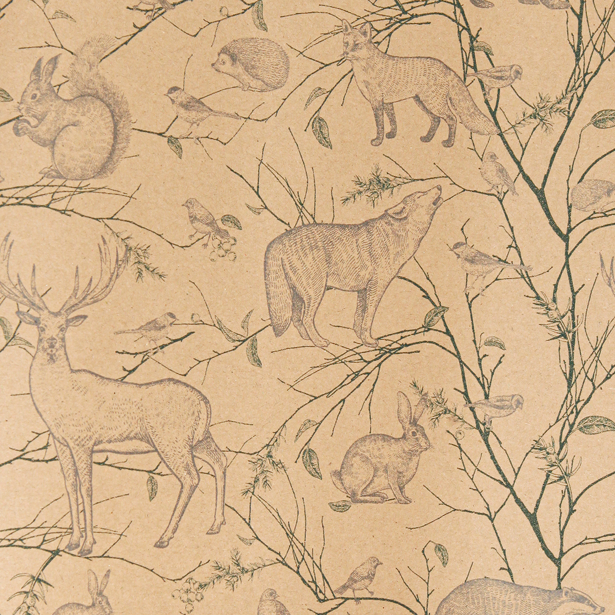 Hnědý balicí papír s lesními zvířátky v modré barvě: Přirozená elegance pro vaše dárky