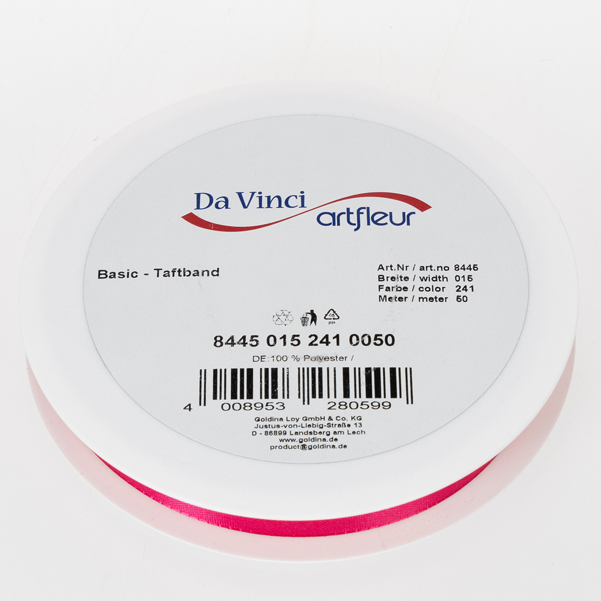 Růžová dárková a ozdobná stuha měří asi 15 milimetrů na šířku a asi 50 metrů na délku. Skládá se ze 100% polyamidu a je vám dodáván na plastové cívce.