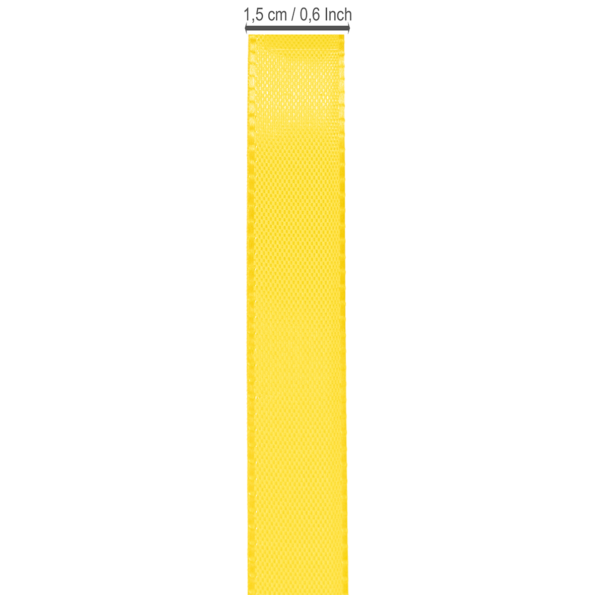 Žlutá dárková a dekorační stuha, vyrobená ze 100% polyesteru, je široká přibližně 15 milimetrů a dlouhá asi 50 metrů. Je navinutá na praktické plastové cívce.