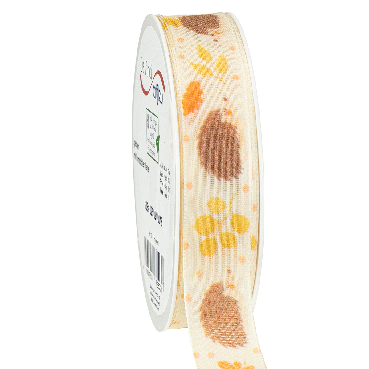 Roztomilá dárková stuha s ježkem je vyrobena ze 100% polyesteru a je navinutá na plastové cívce. Měří asi 15 milimetrů na šířku a asi 18 metrů na délku.