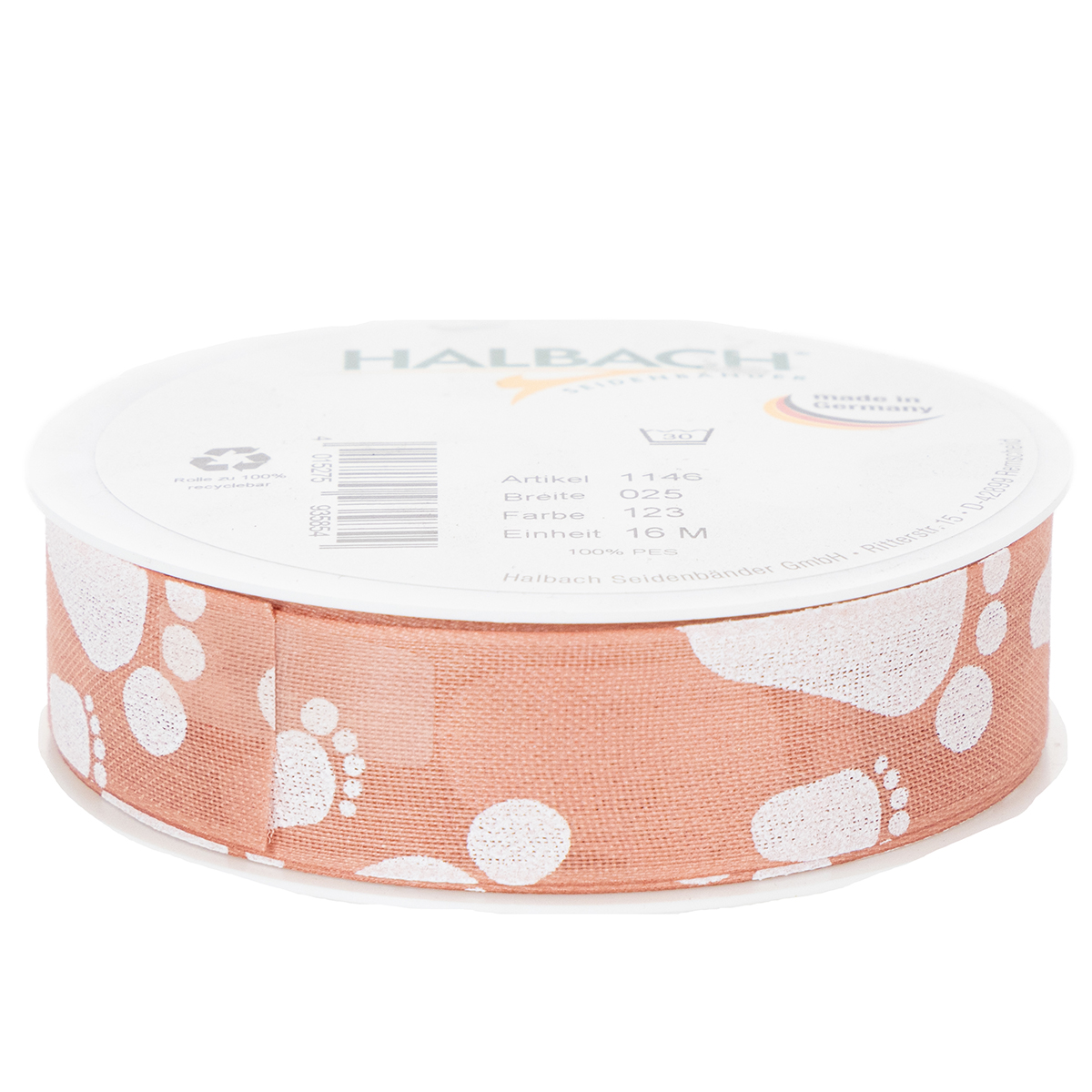 Dárková stuha s nožičkami je kvalitní plastová stuha německé výroby. Hedvábnou stuhu lze prát v pračce do 30°C. Sešité okraje zabraňují roztřepení pásky.
