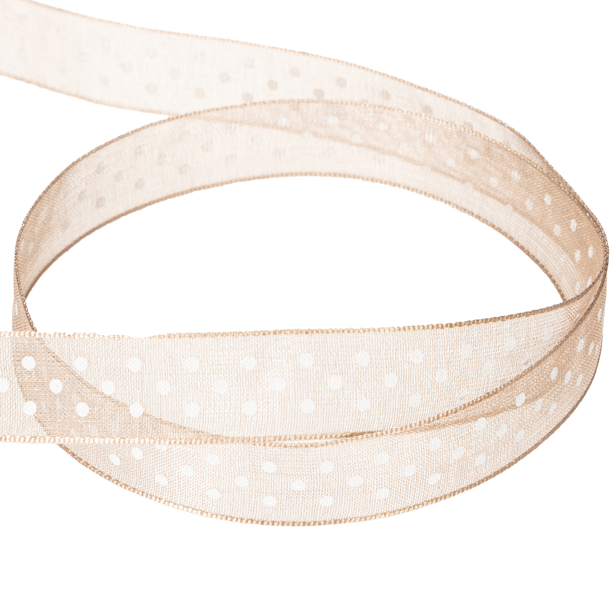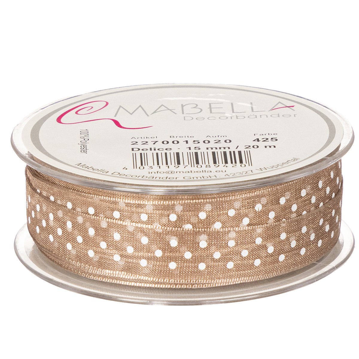 Co dělá naši dárkovou stuhu s puntíky tak výjimečnou? Je to jedinečná kombinace designu, kvality a všestrannosti. Teplá hnědá barva s veselými bílými puntíky je nejen nadčasová, ale také se krásně hodí k různým stylům. Ať už rustikální na jutě, moderní s lesklým papírem nebo hravé na barevných papírových taškách – tyto stuhy dodávají kreativní nádech. Stuha je vyrobena ze 100% polyesteru, takže je příjemně robustní a zároveň snadno se s ní manipuluje. Snadno se váže do krásných mašlí, řeže se bez třepení a drží tvar, aniž by sklouzávala. Ideální pro všechny kutilské projekty nebo profesionální dekorace. Tato dárková stuha je vhodná zejména pro svatební dekorace: představte si romantické prostírání, zdobené židle nebo jako stuhu na svatební kytici. Skvěle ale vypadá i na balení dárků nebo zdobení váz a luceren. Díky decentnímu barevnému schématu můžete tuto stuhu použít jak pro slavnostní, tak i pro neformální příležitosti, aniž by byla příliš výrazná. Proč ji nezkusit v kombinaci s jinými předměty? Například jemná jutová stuha nebo jemné dřevěné ozdoby by byly ideálním doplňkem harmonického celku.