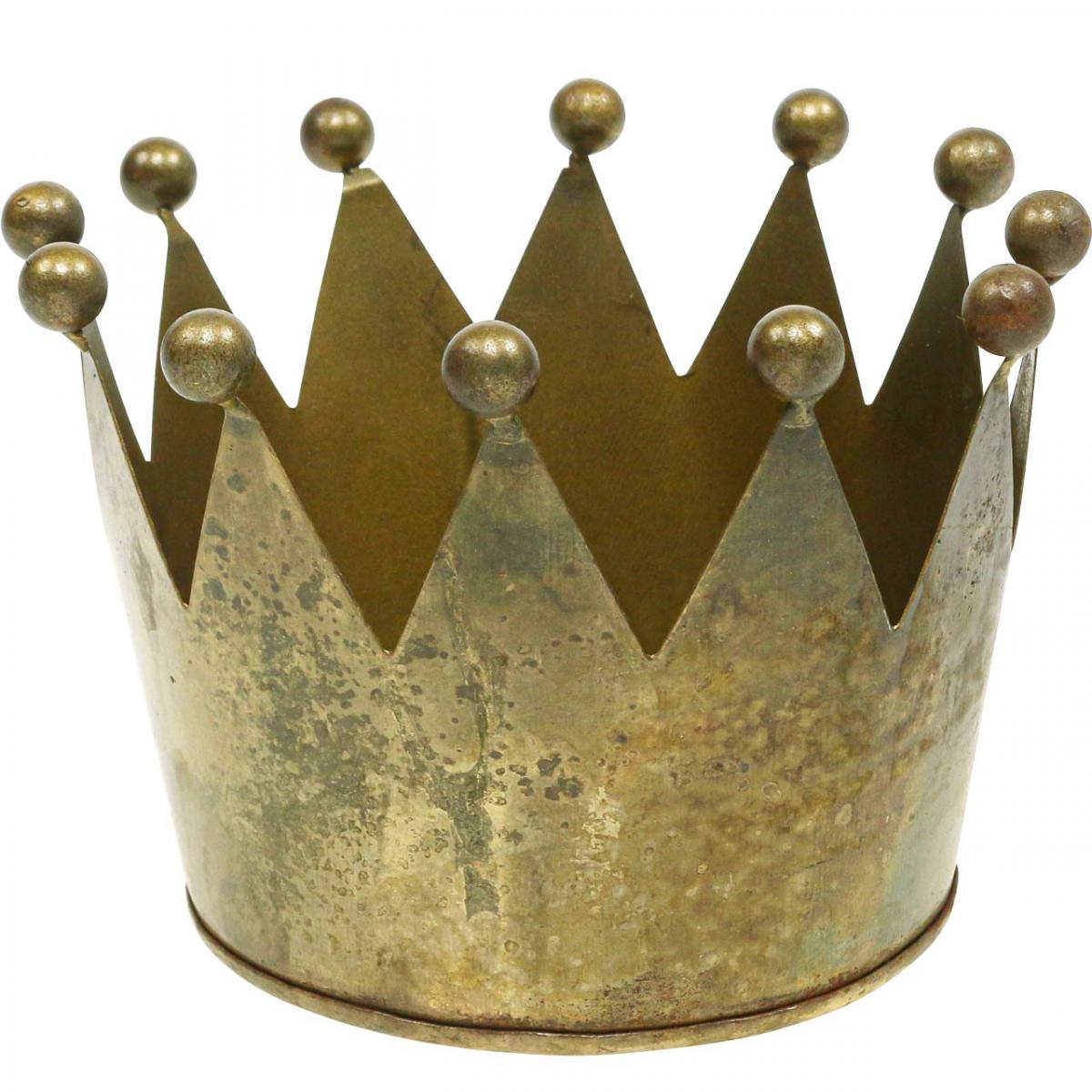 Starožitně vyhlížející ozdobná korunka s mosazným vzhledem je zároveň královským osazením pro sušení aranžmá nebo adventní aranžmá se svíčkou.