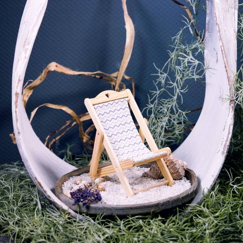 Dekorativní nábytek, vyrobený výhradně z přírodních materiálů dřeva a lnu, zaujme svým přitažlivým designem. V žádném případě nejde o jednoduchou imitaci lehátka. Dekorativní kousek vlastně funguje jako skutečné plážové křeslo, které lze složit a je výškově nastavitelné. Malé detaily, jako je ražení ve tvaru srdce nebo klikatý vzor v námořních barvách završují výrazný design lehátka. Dřevěný nábytek se tak stává mimořádně všestranným dekorativním prvkem: Můžete do něj například umístit i ozdobnou figurku a nechat ji koukat do dálky. A když si nejmenší vezmou dřevěné lehátko na hraní, nemusí to být problém, protože je robustní a kvalitní.