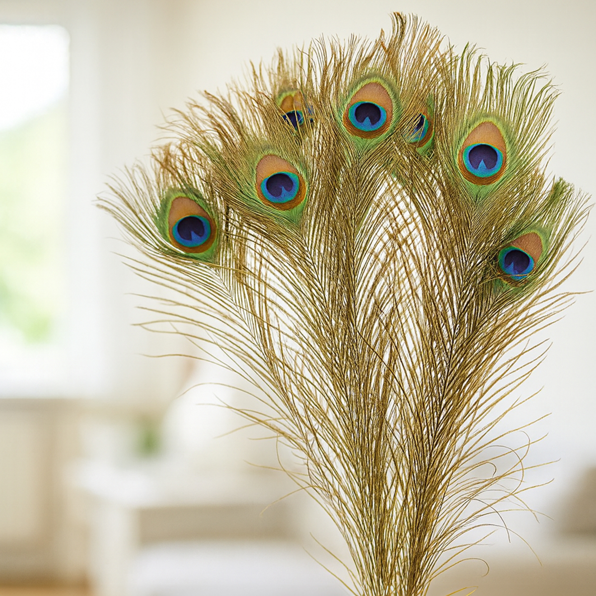 Duhově třpytivé paví oči jsou vrcholem těchto dekorativních peří. Tato pečlivě ručně sbíraná ptačí peří mají dlouhé bílé brko, díky čemuž jsou ideální do váz, ale dají se také lepit, přivazovat nebo připevňovat drátem k nábytku a dekoracím.