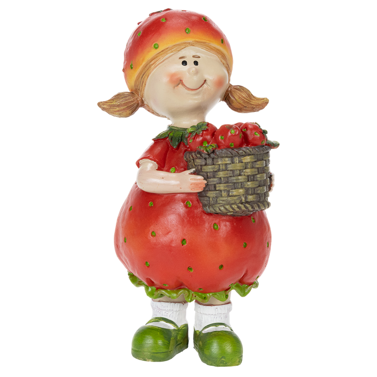 Dekorativní figurka Jahodová dívka s výškou 18 centimetrů a propracovanými detaily dodá každé místnosti nádech pohádkové magie. Figurka v zářivě červené a zelené barvě se skvěle hodí k ozdobení balkonových rohů plných květin, polic v obývacím pokoji nebo letních párty stolů. Rozkošné jahodové šaty, sladké zapletené vlasy a košík přeplněný jahodami vytvářejí harmonický celkový vzhled.