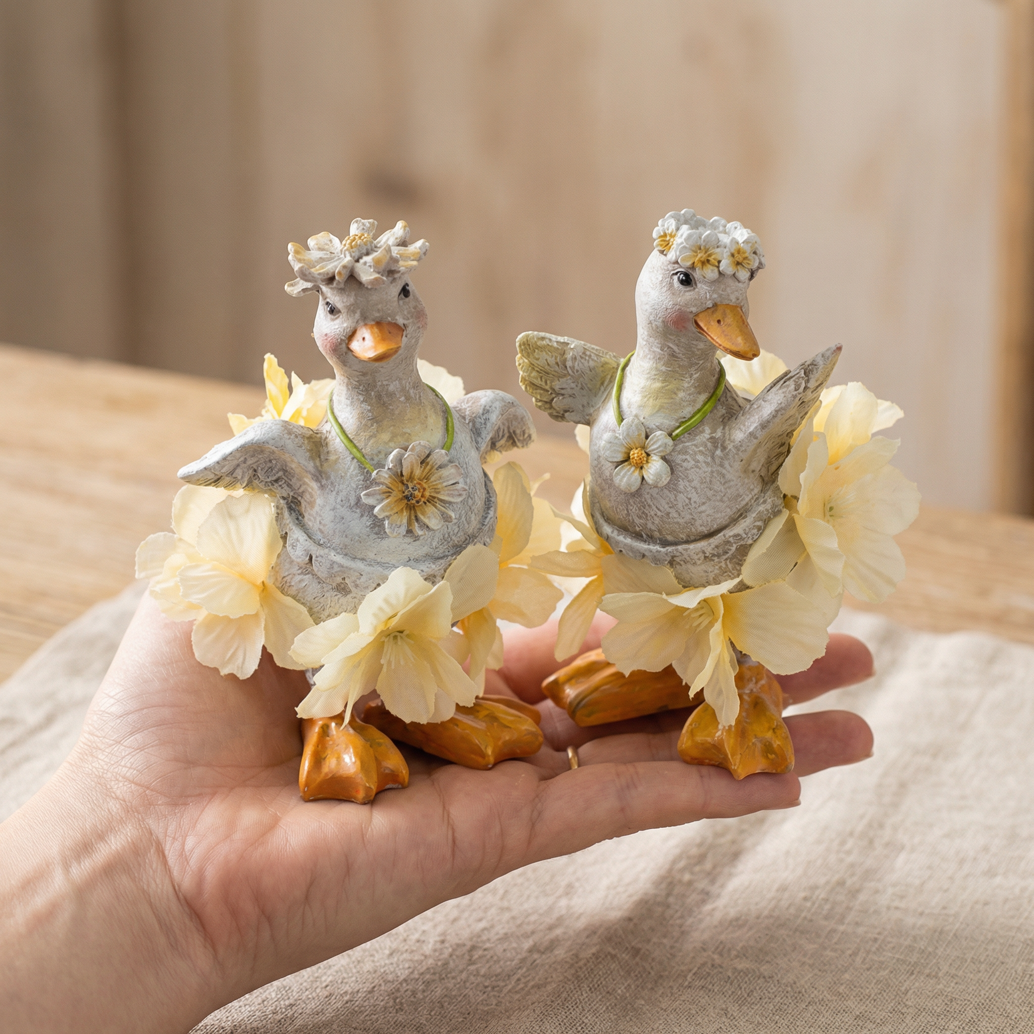 Tyto jemné kachničky, které se hodí do skandinávského nebo moderního prostředí, krásně ladí s lehkými, přírodními materiály, jako je dřevo a len. Jsou ideální jako jarní nebo velikonoční dekorace pro vytvoření veselé atmosféry.