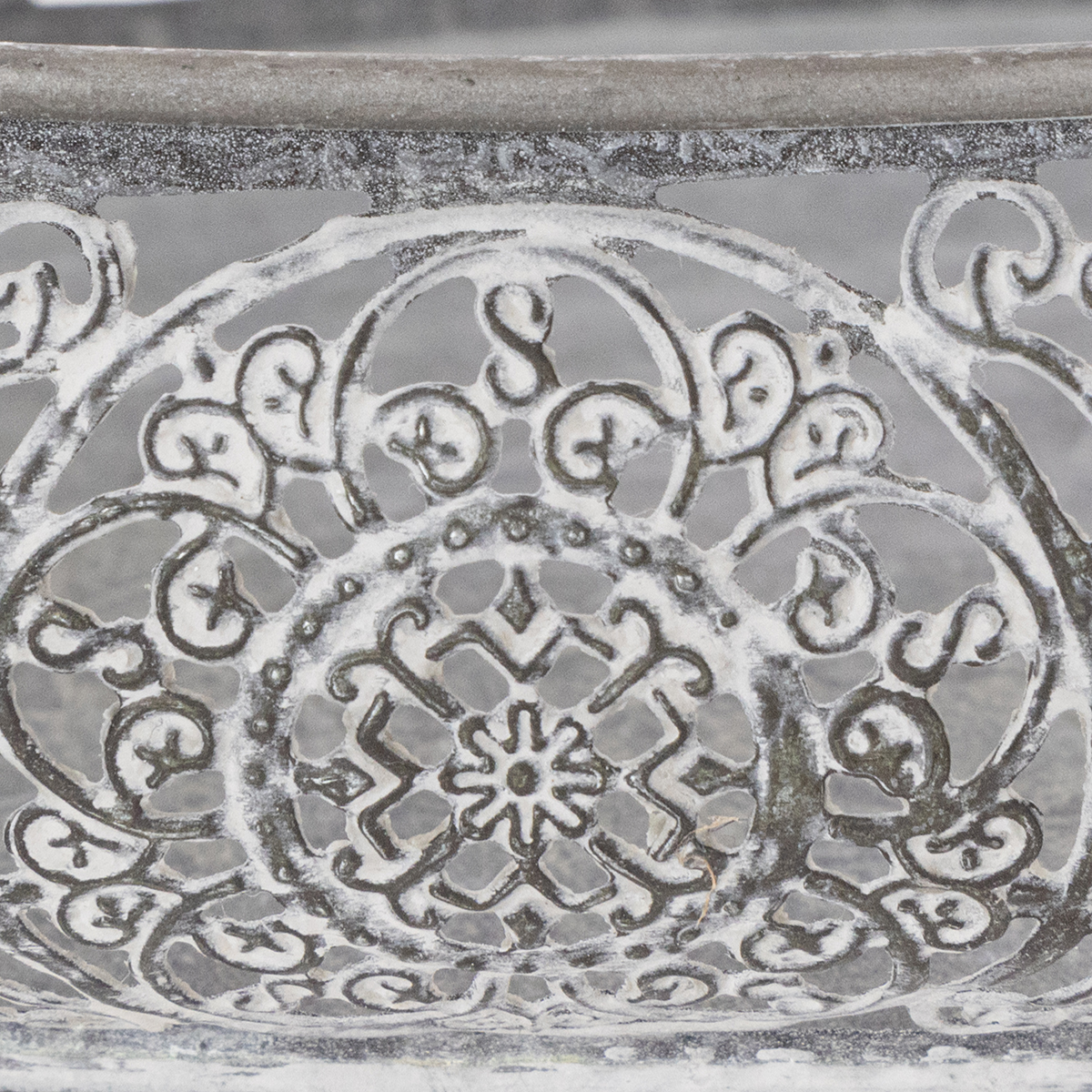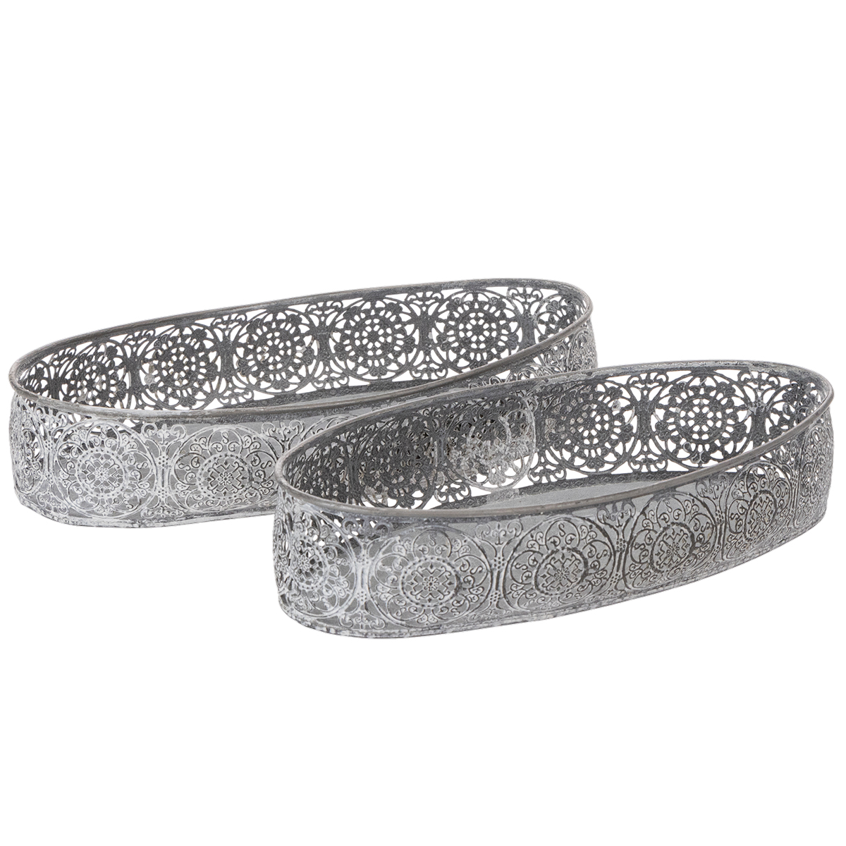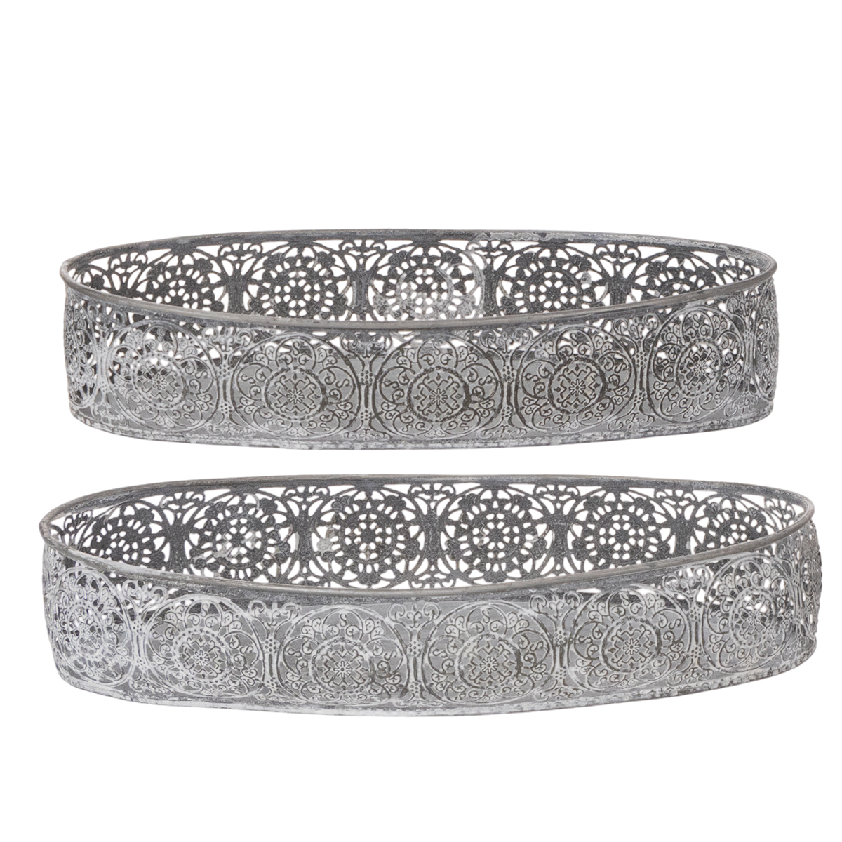 Tyto dvě krásné ozdobné mísy vyrobené z kovu a s ozdobným okrajem si určitě najdou místo na vaší komodě nebo příborníku. Kovové misky ladí s filigránovým květinovým vzorem a jsou stříbrošedé a prané bílé. Ideální na komodu v trendy vintage stylu!