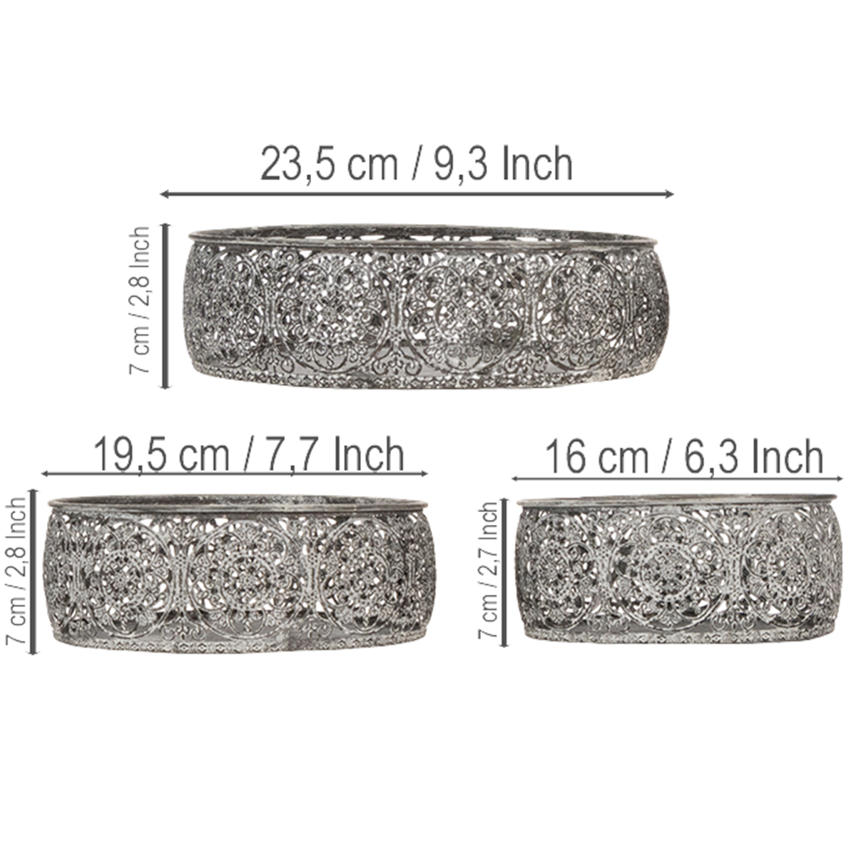 Tři kulaté misky v různých průměrech lze použít různými způsoby pro vaše nápady na dekorace. Stříbrná šedá v kombinaci s bílým mytím se skvěle hodí ke světlým nebo šedým ozdobným kamenům, na kterých by mohly stát svíčky bílé nebo antracitové barvy. Tři dekorativní misky můžete také použít jako dekorativní úložiště pro vaše malé poklady.