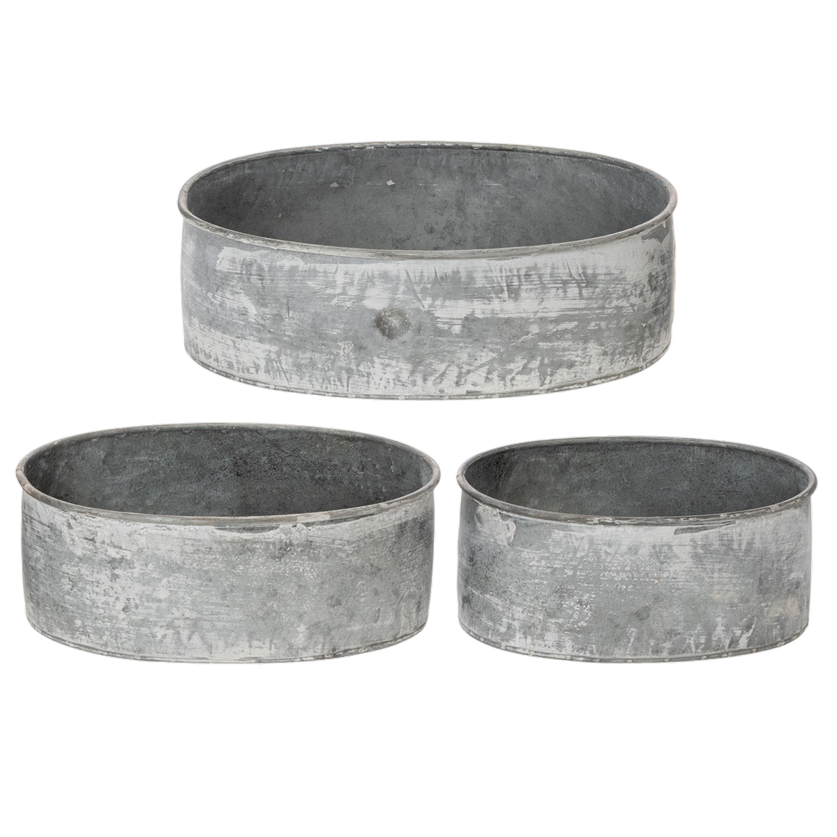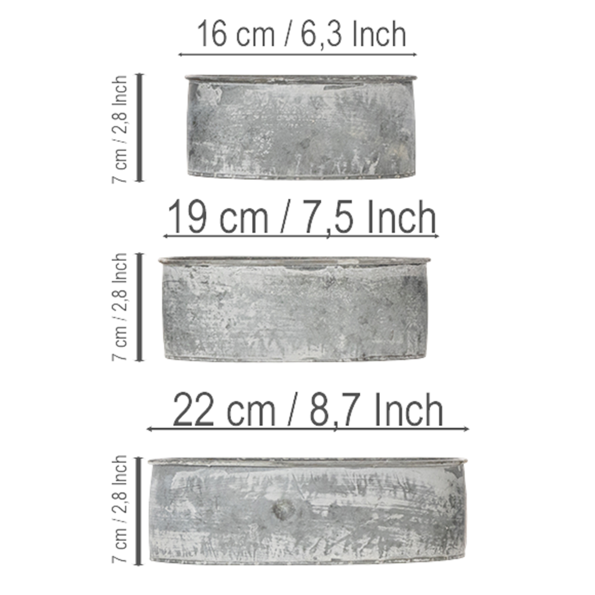 Tyto tři mísy, vyprané v nadčasové šedé a bílé, lze použít pro klasické i vintage aranžmá. Kovové skořepiny jsou elegantně navrženy se zaoblenou hranou.