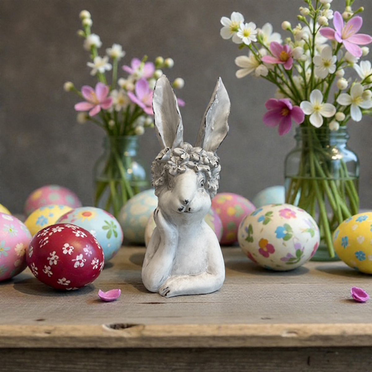 Náš dekorativní králík zaujme harmonickou souhrou decentní elegance a jemných detailů. Výrazná póza s podpůrnou rukou a hravý květinový věnec na hlavě dodávají této figurce jedinečný charakter. Příjemná šedá barva ji činí všestrannou, zatímco vysoce kvalitní keramický materiál zajišťuje stabilitu a odolnost. Je vhodný jak do vnitřních, tak i do krytých venkovních prostor.