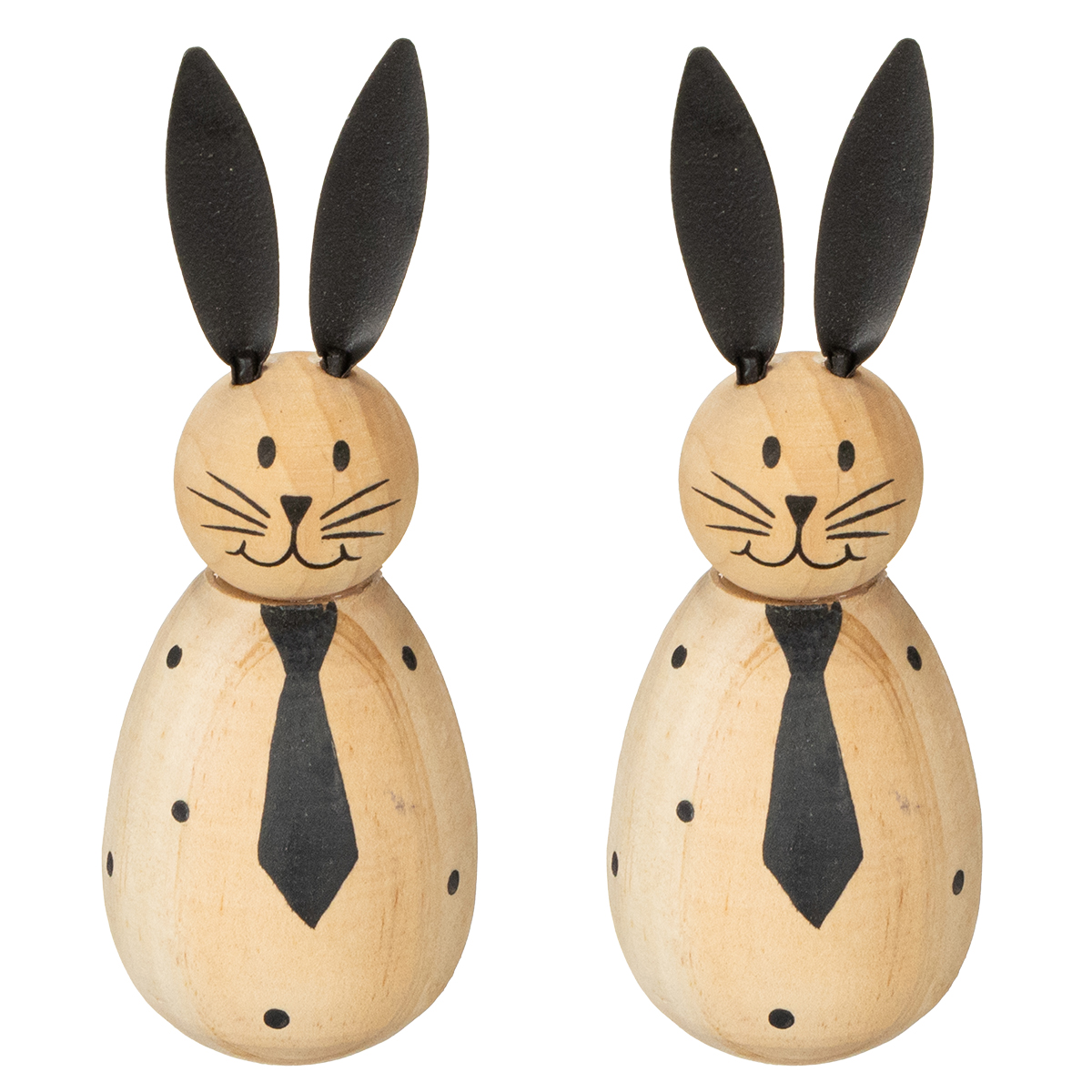 Tyto figurky králíků zaujmou harmonickou souhrou materiálů, barev a tvarů. Těla králíků jsou vyrobena z přírodního dřeva v teplé, světlé barvě a zdobena malými, decentními tečkami. Matně černé kovové uši a hravá kravata doplňují design nádechem moderního šmrncu. Jejich praktická velikost 12 cm na výšku a 4,5 cm v průměru je činí ideálními pro různé dekorace. Ať už jsou vystaveni jako skupina ve velikonočních dekoracích, nebo jako samostatný dekorační prvek na parapetu, tito králíci dodají každému aranžmá okouzlující charakter.