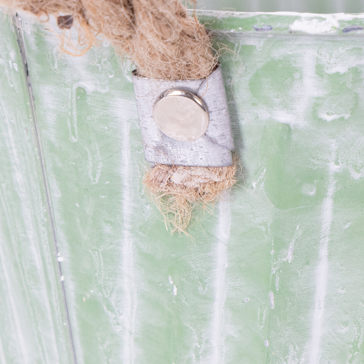 Květináč je vybaven rukojeťmi z jutové šňůry a je natřen bílou barvou. Miska na květináče je také po celém obvodu zdobena reliéfním, jednotným vzorem svislých pruhů. Natření bílou barvou květináčů vytváří krásný kontrast k pastelovým růžovým, zeleným a žlutým základním tónům kovových nádob, díky čemuž vzor kovové dekorace ještě více vyniká!