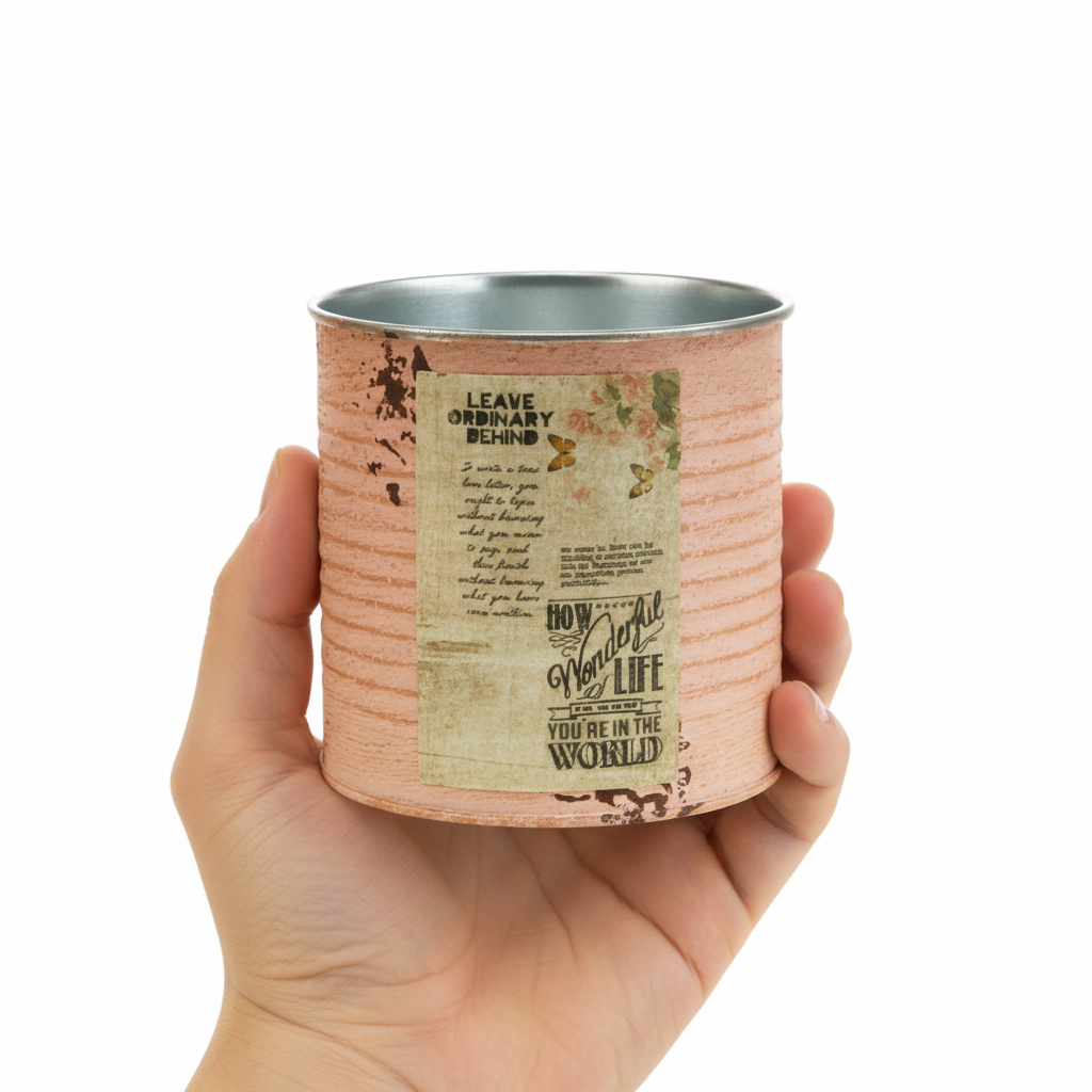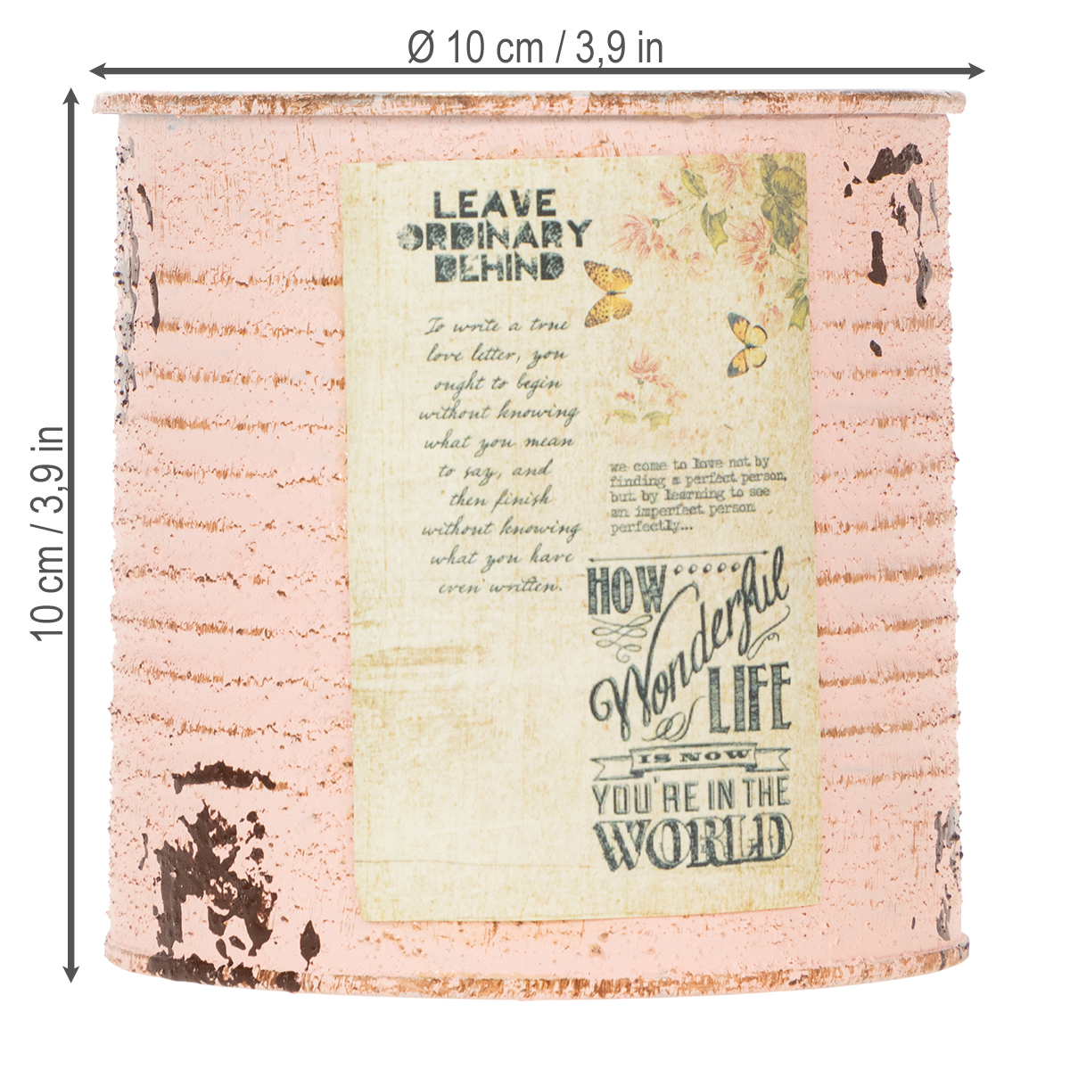 Květináč vyrobený z ozdobné plechovky v pastelové lososové barvě působí minimálně stejně atmosféricky jako pravá vintage plechovka. Letní dekorace z kovu má však rozhodující výhodu v tom, že zde nejsou žádné ostré hrany. Plechovku tak můžete osadit bez rizika poranění. Zpod kartáčované pastelové barvy na drážkách plechu vystupuje rezavě hnědý odstín. Navíc malované rezavé skvrny a nostalgický štítek zdůrazňují ošuntělý šik retro plechovky. Vnitřek dekorativního hrnce je velmi jednoduše proveden ve stříbrné barvě.