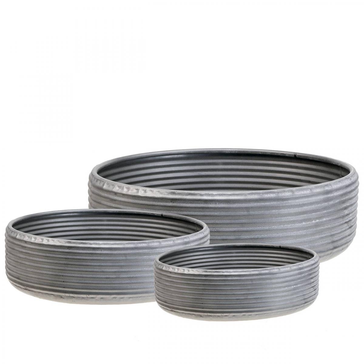 Dekorativní misky jsou vyrobeny z pozinkovaného kovu a mají matný stříbrošedý povrch. Kovová mísa získává ještě více charakteru z velmi decentně vybělených drážek.
