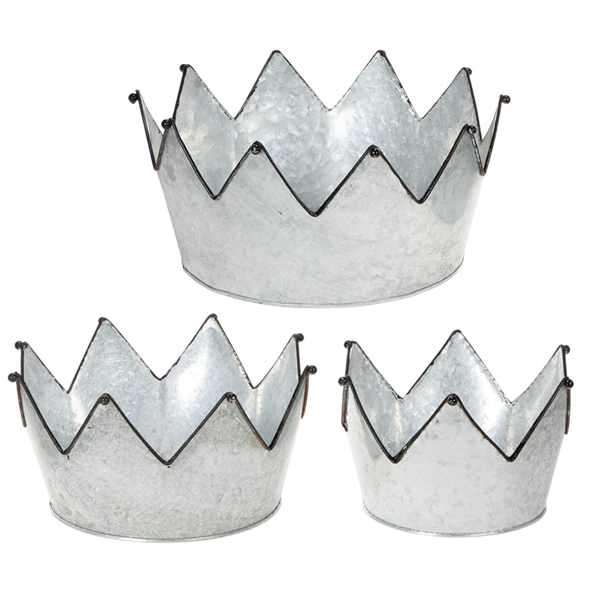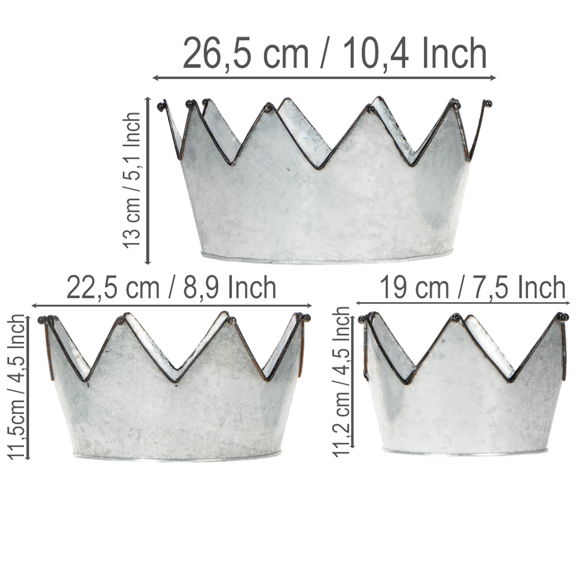 Tři kovové misky vyrobené ze zinku jsou vyráběny v různých velikostech. Společný je jim černý okraj kolem hrotů, které zdobí malá ozdobná kulička. Koule je také černá, aby ladila s vintage dekorací. Černý okraj s ozdobou dává všem jasně najevo: Jsou zde tři korunky - připravené k naplnění nebo k pouhému položení.