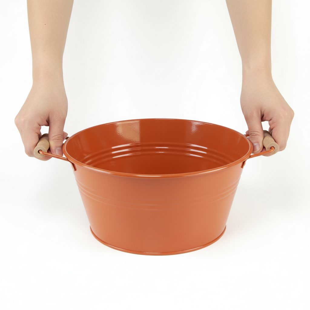 Dekorativní mísa natřená teplými a zemitými barvami ještě krásněji září zelenými rostlinami. Obzvláště krásné jsou kliky se soustruženými držadly z neopracovaného dřeva. Kovová mísa vypadá stejně jako mísa, která se dříve používala v domácnosti a v zemědělství.