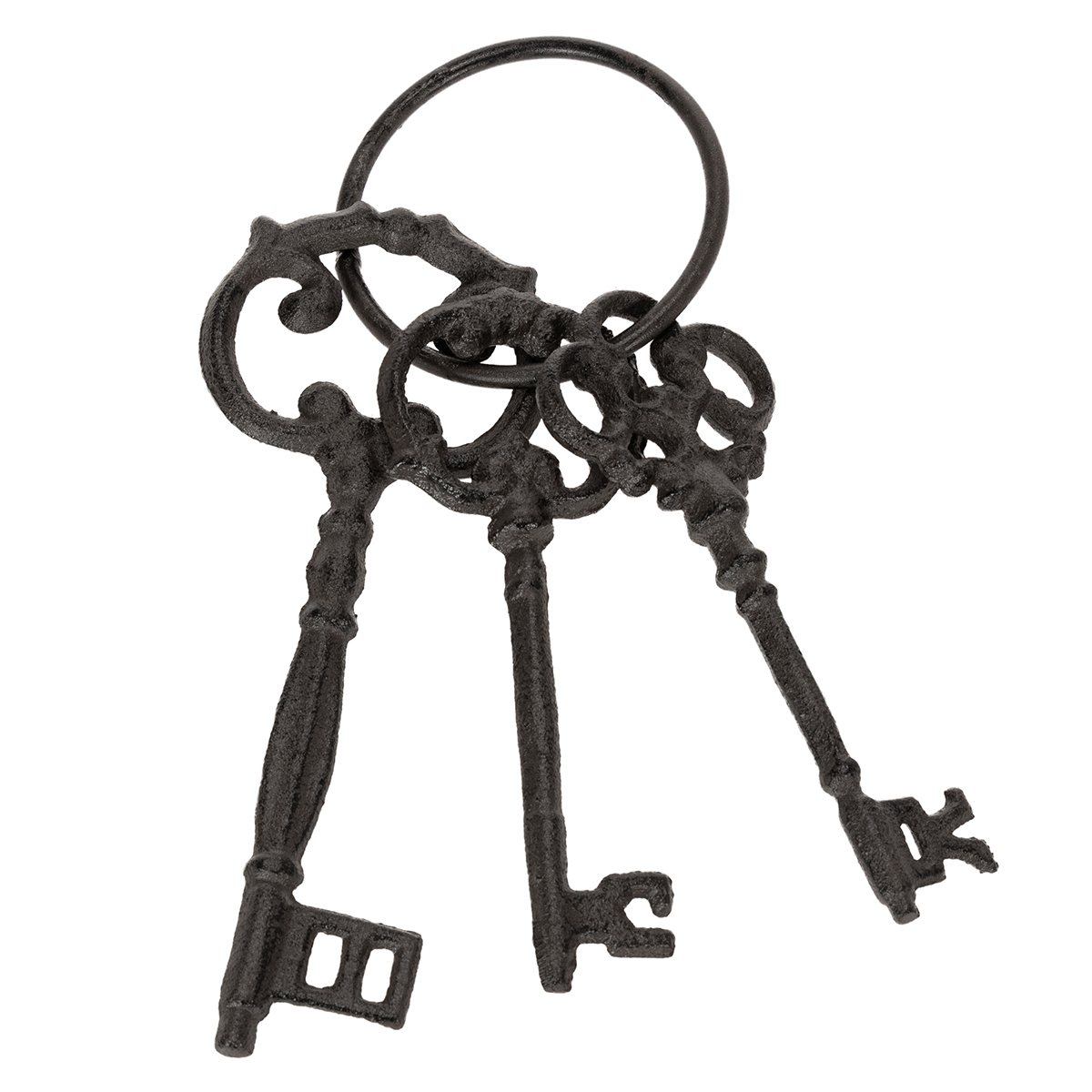 - Design: tři různé klíče ve tvaru připomínajícím starožitné modely, připevněné na kroužku