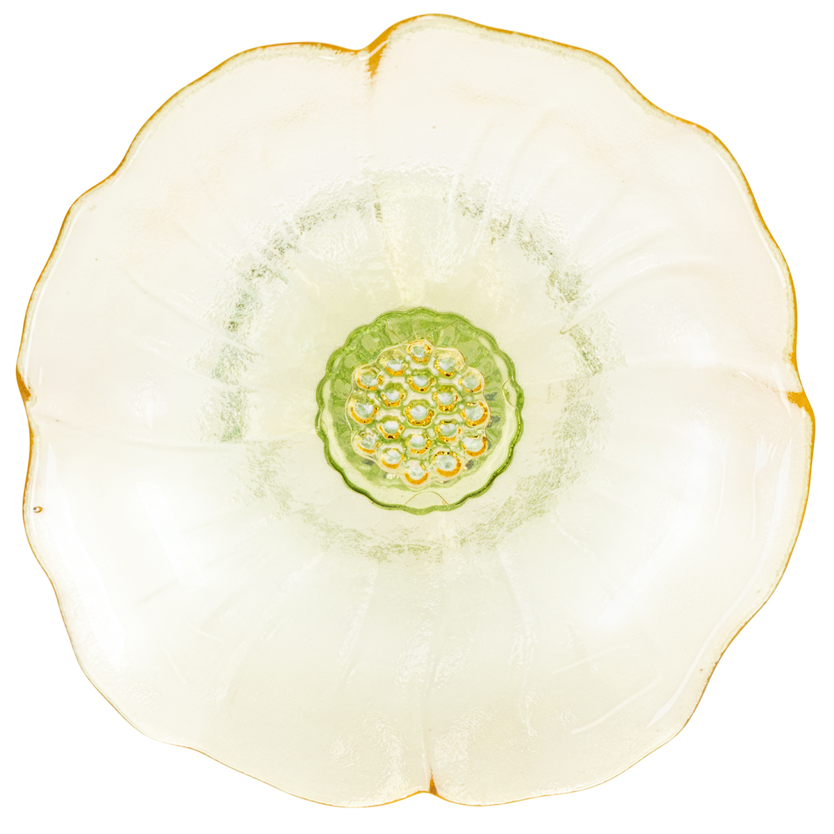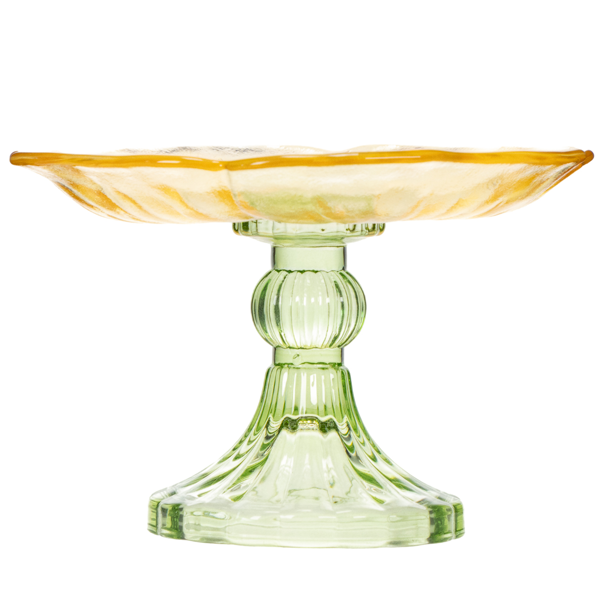 Tento krásný slavnostní skleněný dekorativní talíř s podstavcem na noze je skutečným poutačem díky svému jemnému květinovému vzoru. Zelené, čiré skleněné podstavce elegantně zvýrazňuje jemné žluté květy a dodává talíři lehký a vzdušný vzhled. Použijte jej ke stylové prezentaci jemně zabalených sladkostí, malých dortíků nebo pečiva. Díky svému nadčasovému designu doplní moderní i rustikální prostředí. Ideální pro zvláštní příležitosti, jako jsou svatby, Velikonoce nebo narozeniny – nebo jednoduše jako ozdoba vašeho každodenního prostírání.