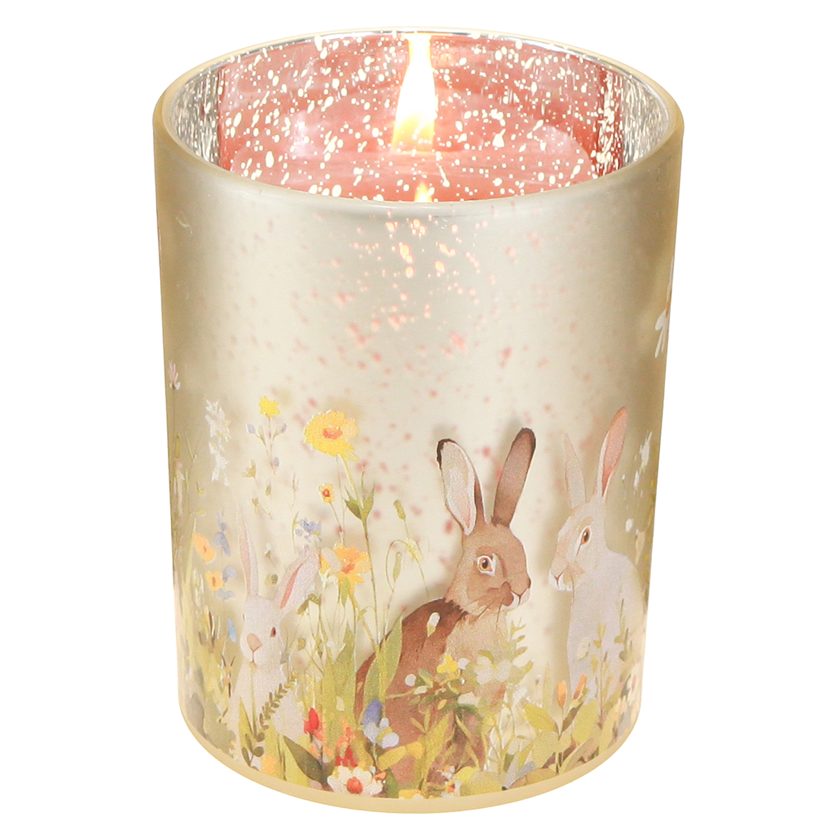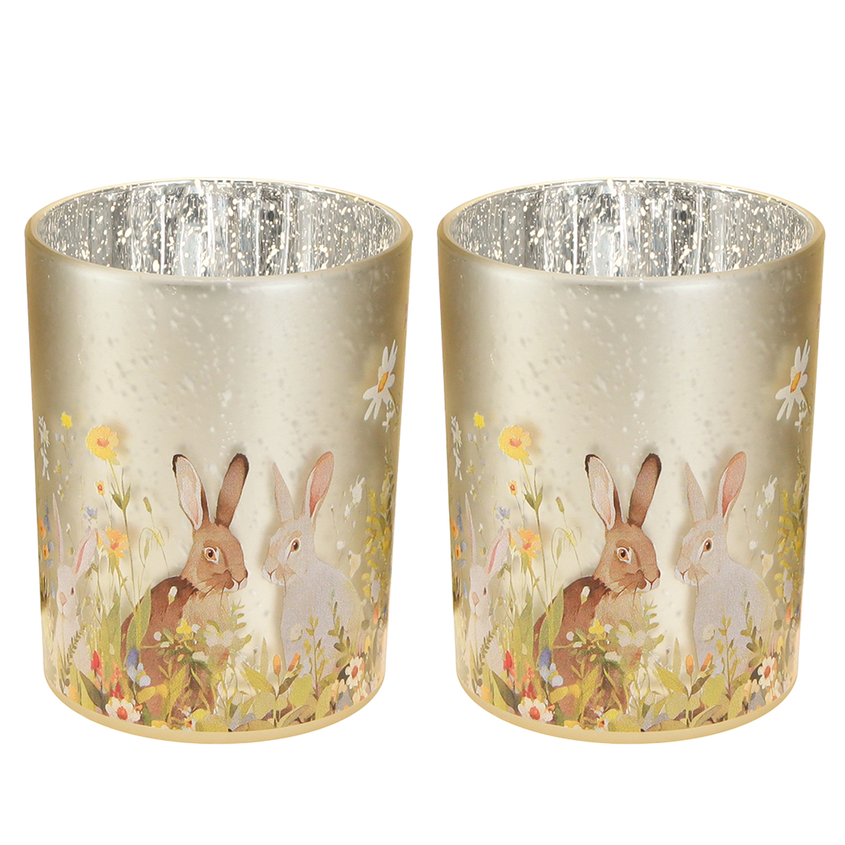 Dekorativní skleněná lucerna s motivem velikonočního zajíčka pro jarní dekoraci domova, 12,5 cm, 2 kusy.
