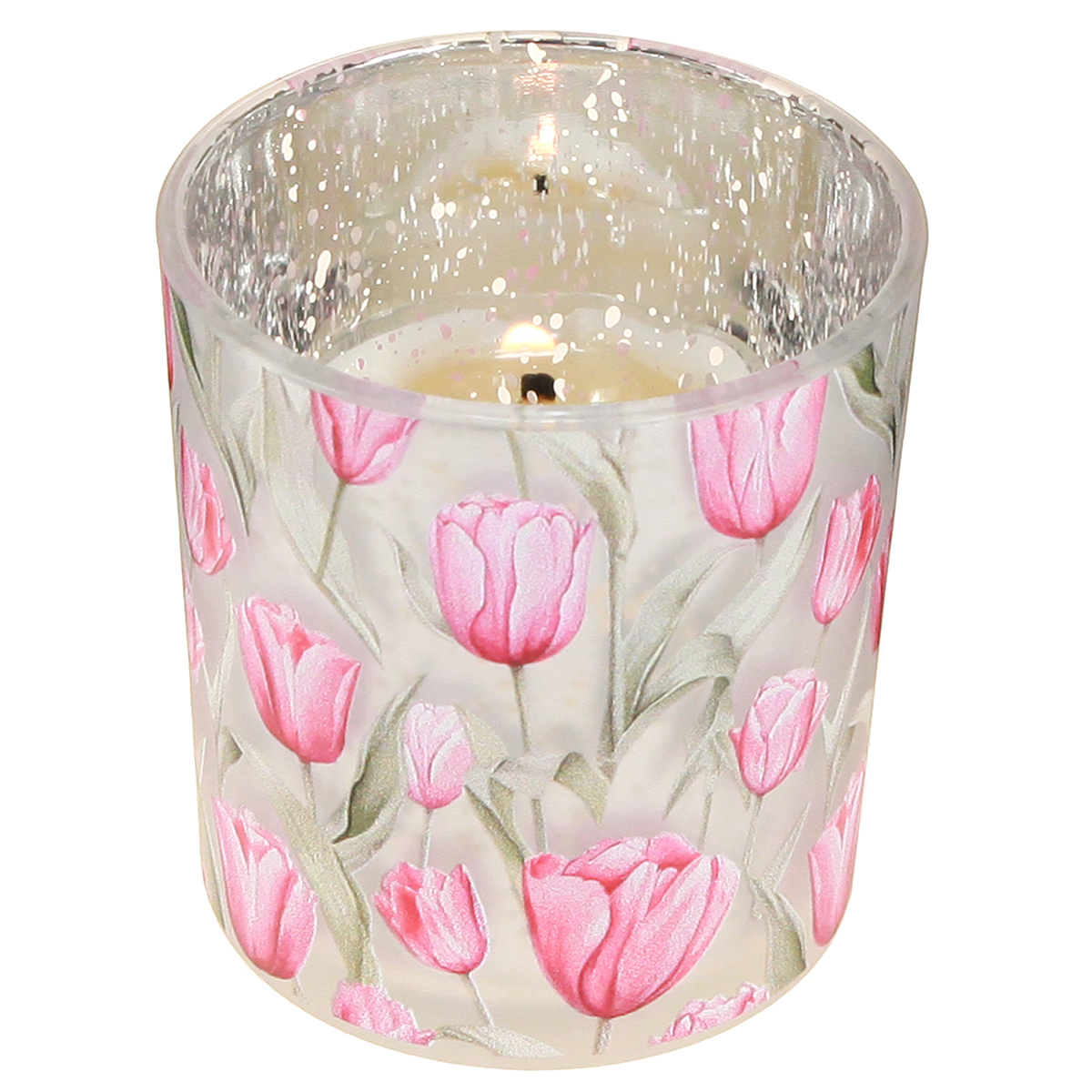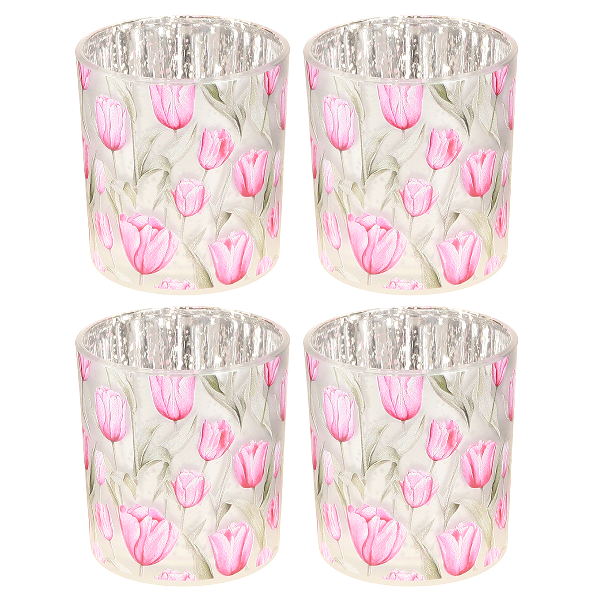 Dekorativní skleněná lucerna s tulipánovým vzorem pro jarní dekoraci domova, 8 cm, 4 kusy.