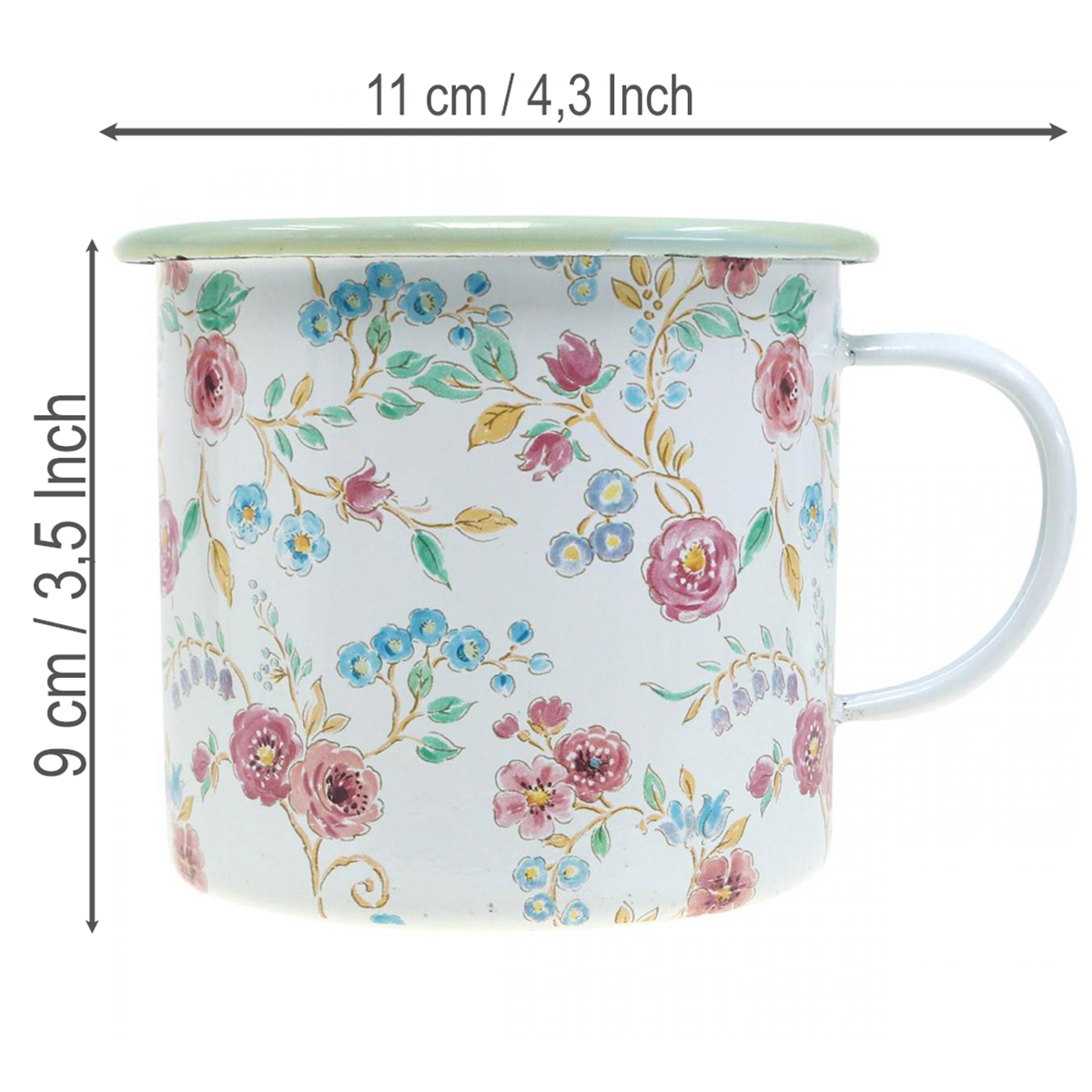 Ve světlých pastelových barvách na bílém podkladu nabízí květináč s růžemi smaltované zdobení, které nostalgicky evokuje léto. Ozdobný hrnek s ouškem má pastelově zbarvený okraj ve světle zelené barvě a zvenku je po celém obvodu potištěn bohatě zdobeným květinovým motivem. Výsadbový pohár lze vyplnit tenkou vrstvou štěrku nebo písku jako drenáž a zeminou nebo suchou nebo mokrou květinovou pěnou.