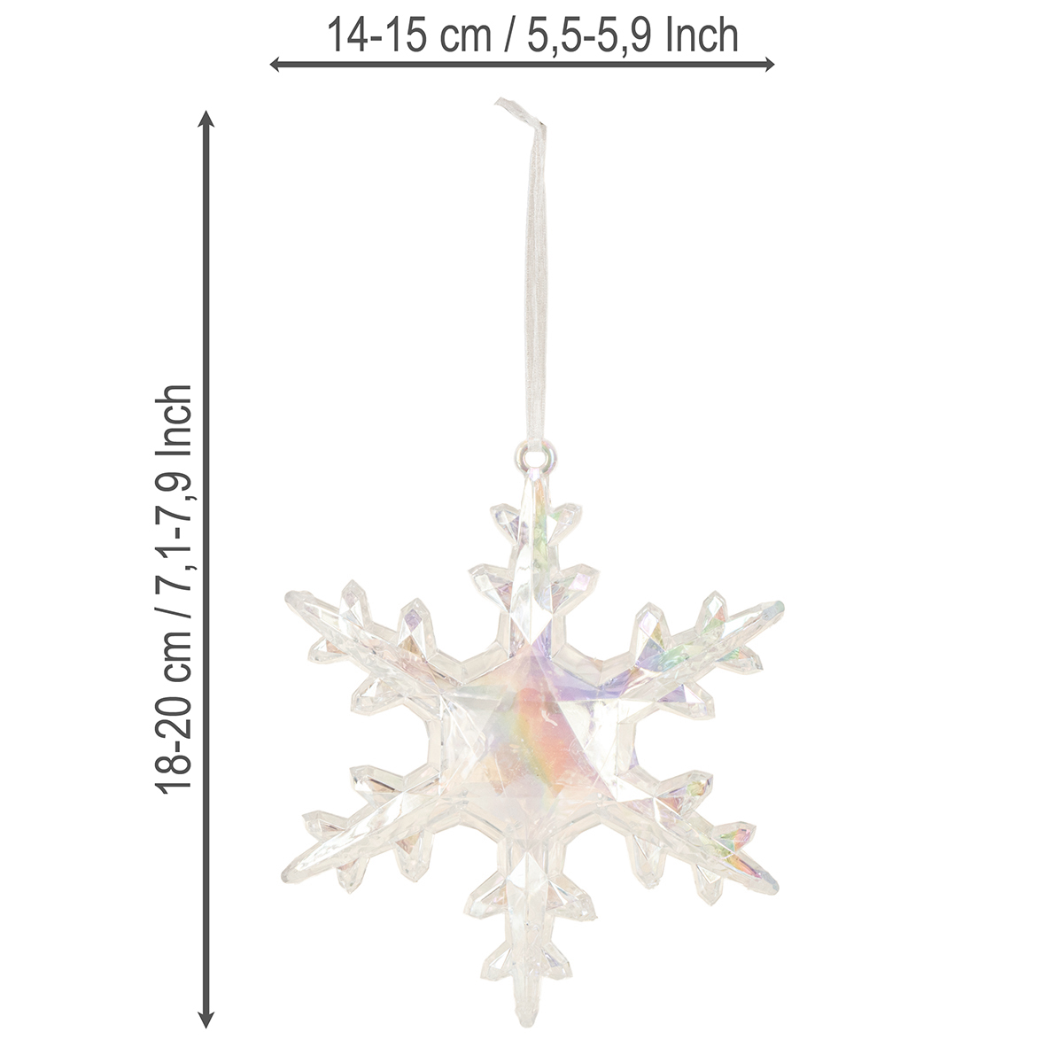 Zažijte kouzlo zimy s našimi duhovými dekorativními sněhovými vločkami. Tyto umně navržené sněhové vločky o průměru 14-15 cm jsou dokonalým prvkem, který dodá vašemu bydlení elegantní a zimní atmosféru. Ať už jako závěsná vánoční dekorace, jako třpytivá dekorace na okno nebo jako ozdoba vašeho vánočního stromku – tato sněhová dekorace zaručeně přitáhne pozornost každého. Třpytivé povrchy odrážejí světlo a dodávají vaší dekoraci okouzlující nádech. Jsou vyrobeny z vysoce kvalitního plastu, jsou pevné a odolné, takže si je užijete po mnoho zim.