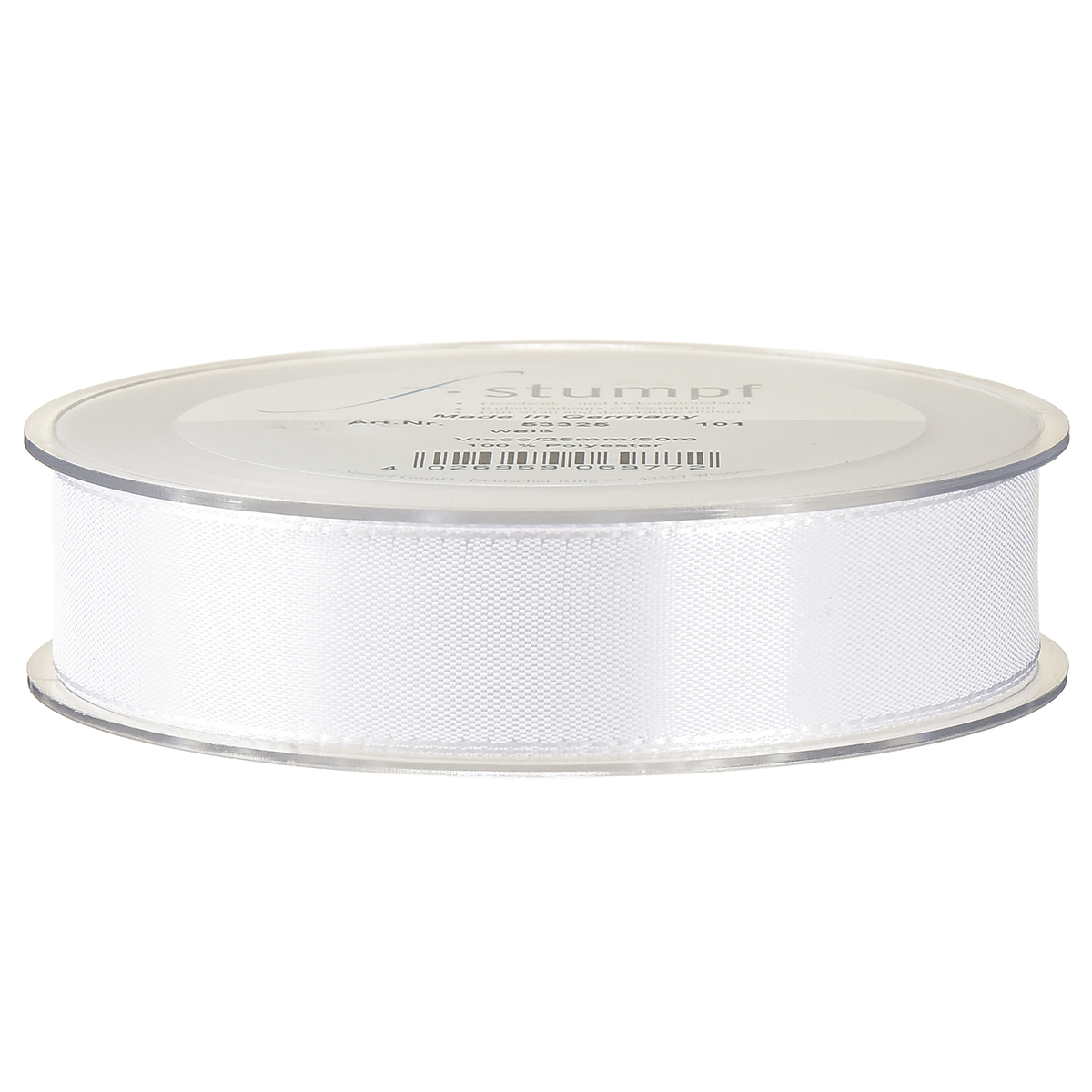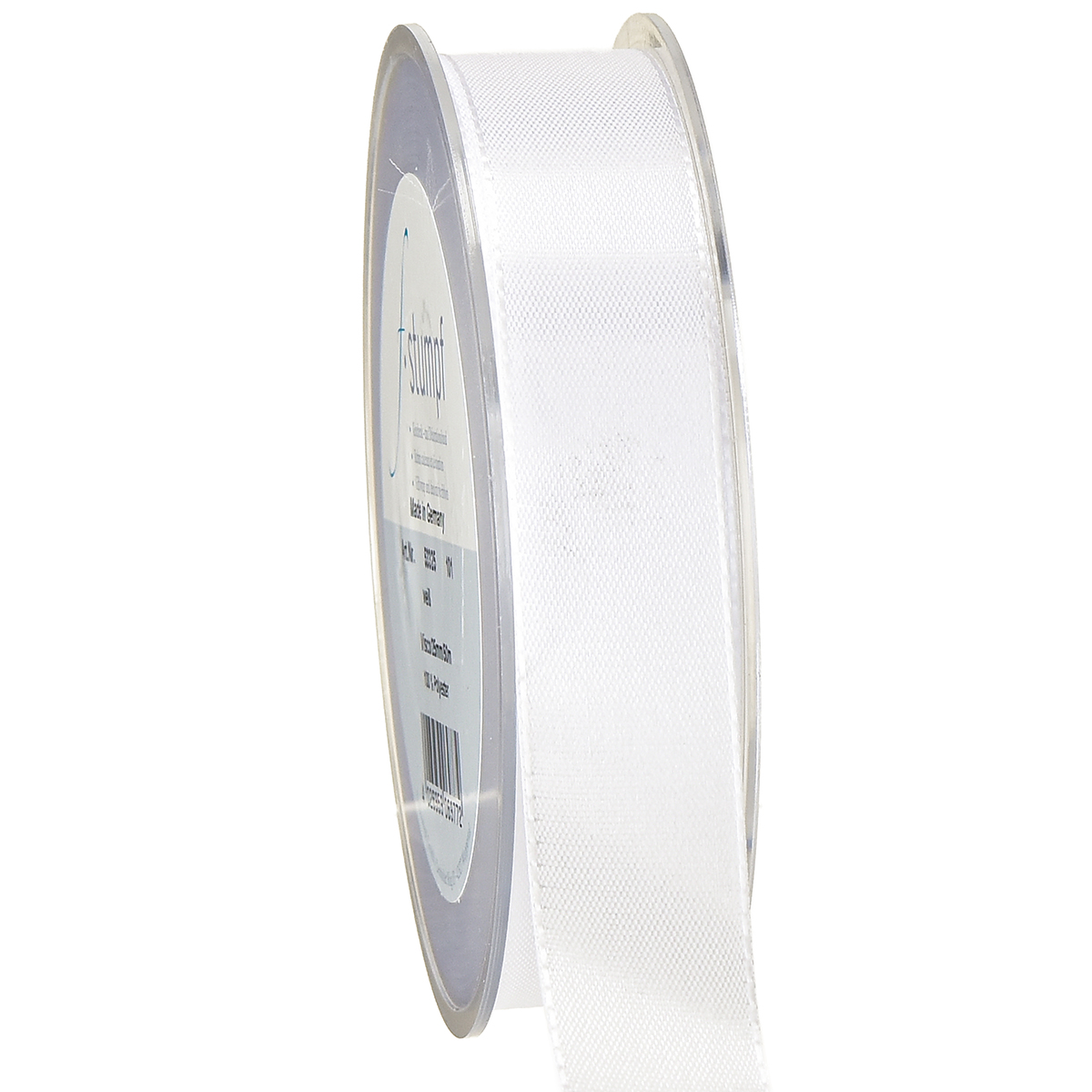 Bílá polyesterová dekorační stuha je navinutá na plastové cívce, kterou lze pro snadnou manipulaci zavěsit. S šířkou přibližně 25 milimetrů je dlouhá přibližně 50 metrů.