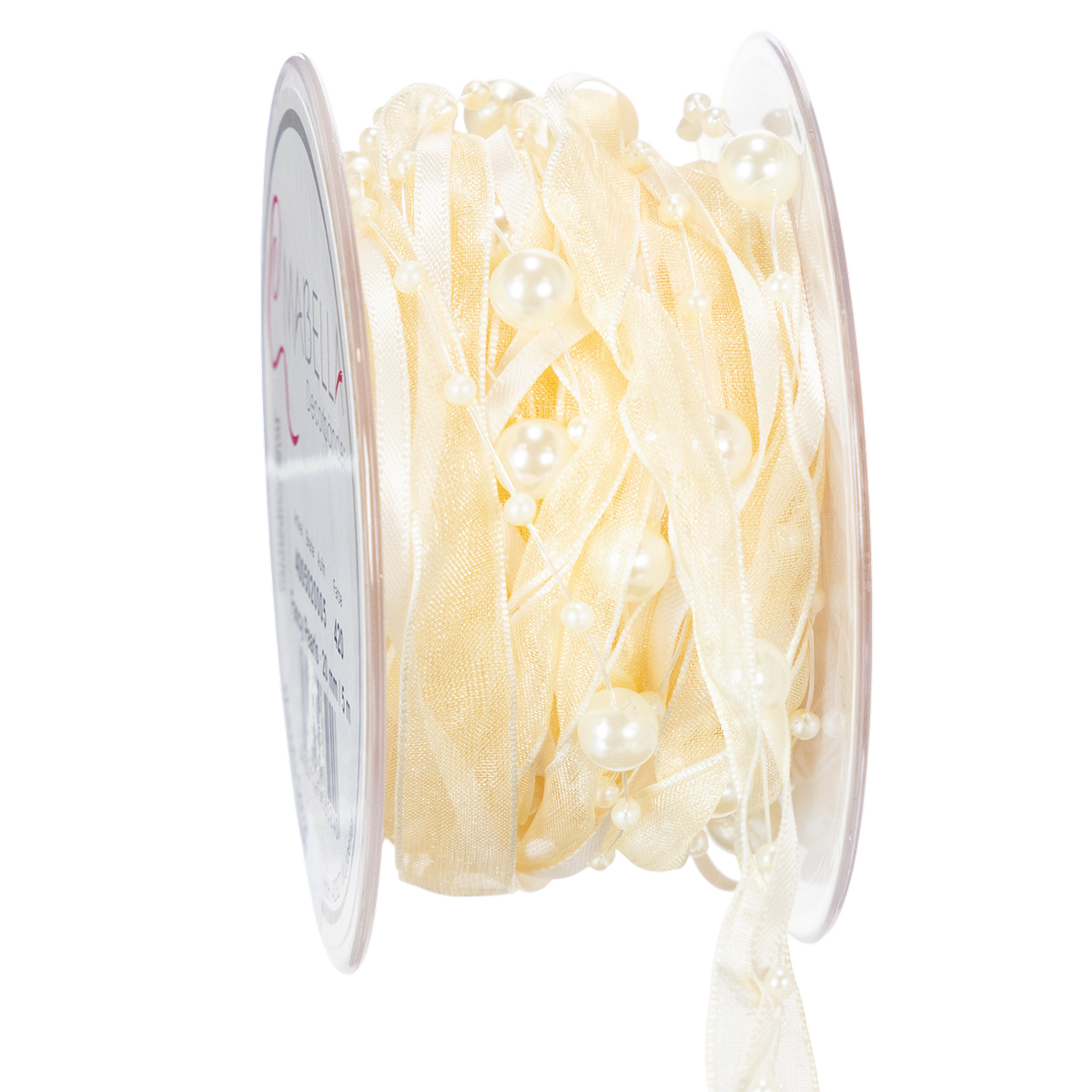 Ozdobná stuha s perličkami v krémové barvě je navinuta na ruličce z plastu a má délku cca 5 metrů a šířku cca 20 milimetrů. Perly mají průměr kolem 2 až 7 milimetrů.