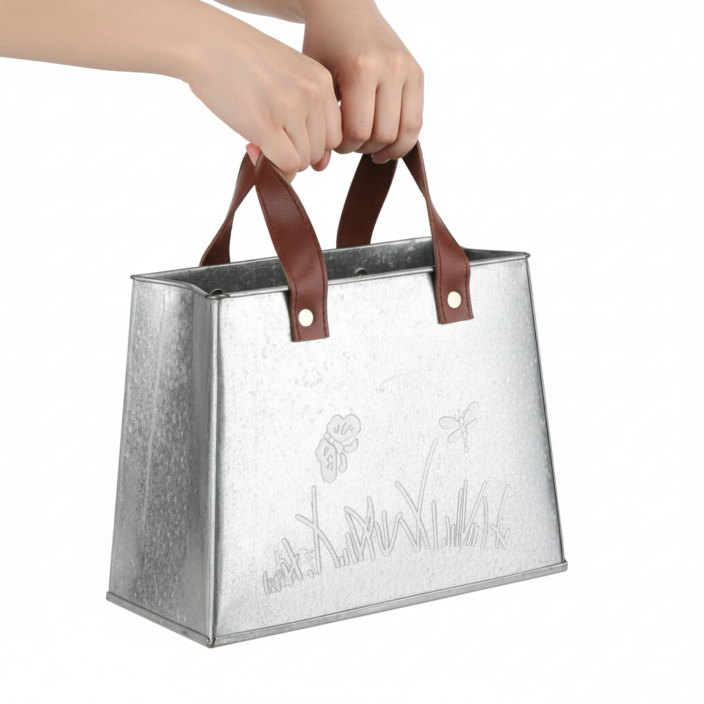 Naše ozdobné kovové tašky stříbrné barvy kombinují funkčnost a design mimořádným způsobem. Tyto květináče jsou ideální pro dekoratéry, kreativní mysli a každého, kdo chce svému domovu dodat nádech elegance. S bílým motivem motýlů a trav na obou stranách a hnědými rukojeťmi z umělé kůže získáte produkt, který se hodí jak jako květináč, tak i jako dekorativní prvek na balkon nebo stůl. Tato dekorativní taška na rostliny podtrhuje rustikální kouzlo a krásně se hodí k ostatním vintage dekoracím. Dodejte svému domovu osobitost s těmito mimořádnými kovovými květináči, které zaujmou jednoduchou, nadčasovou elegancí.