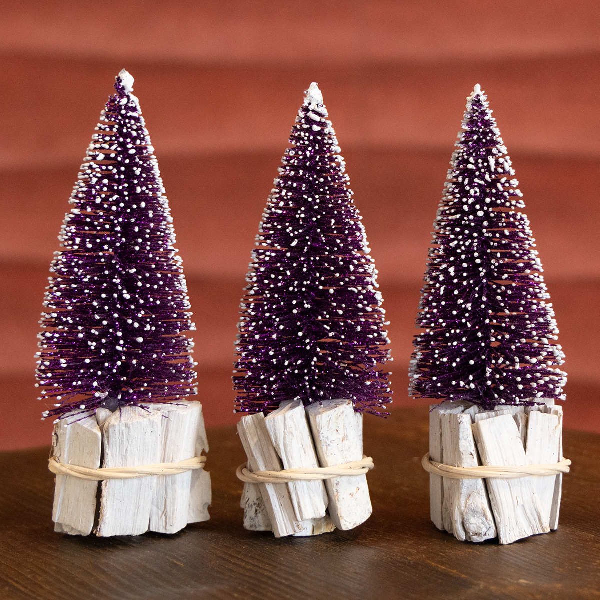 Název produktu: Dekorativní vánoční stromeček ve fialové barvě se sněhovou špičkou na rustikálním dřevěném podstavci 15 cm, 3 kusy.
