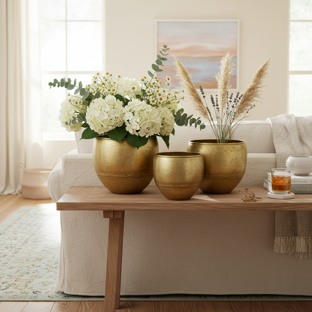 Kulatá věc! Kompaktní dekorativní vázy s mosazným vzhledem jsou k dispozici v sadě po třech. Velikostně různé, báječně se hodí na parapety nebo na komody. Dekorativní vázy lze v souladu s jejich matným zlatým tónem naplnit vánočními větvemi o Vánocích nebo postavit jako důstojnou ozdobnou nádobu na smuteční obřad.