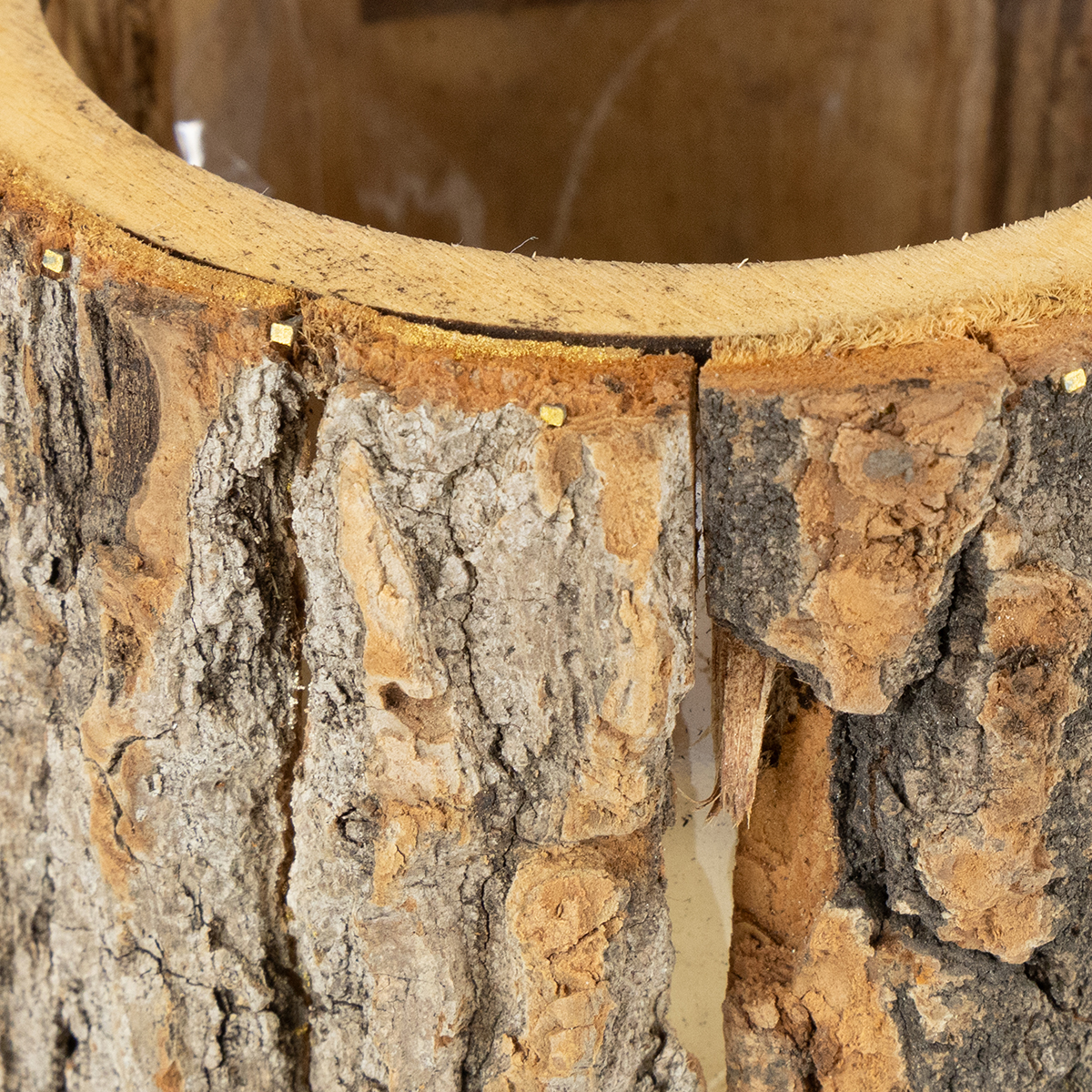 Kulatý květináč se skládá z kompozitní stromové kůry, která mu dodává tento neobvyklý vzhled.