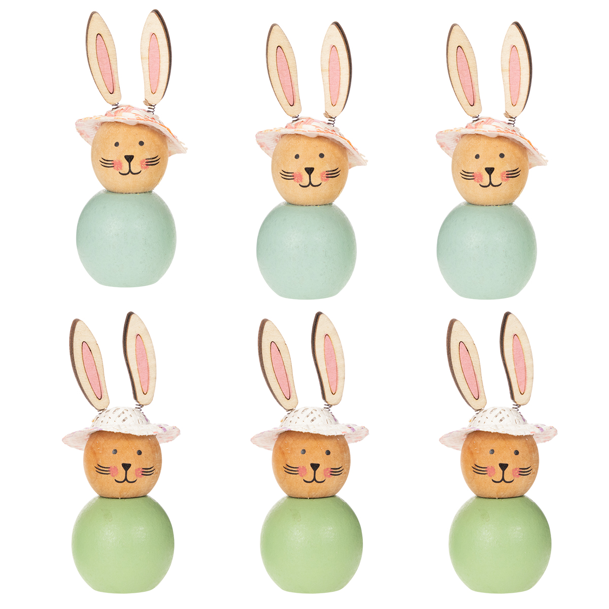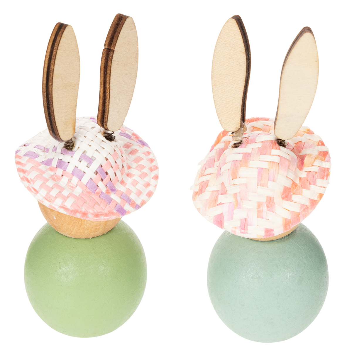 Tyto dřevěné figurky zaujmou svým přirozeným šarmem a veselým vzhledem: čiré dřevo v kombinaci s jemnými odstíny zelené a mátové se setkává s hravým designem. Zejména růžové klobouky dodávají figurkám stylový vintage nádech. Každý králík je vysoký přibližně 9 cm a do vašeho domova vnese nádech jara. Uši na kovových pružinách jsou nejen vizuálně výrazné, ale také dodávají živý detail, který jistě upoutá pozornost.