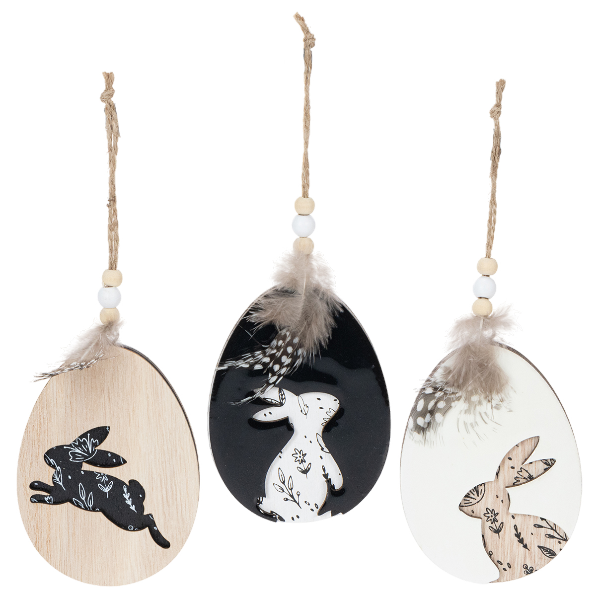 Dřevěná velikonoční vajíčka k zavěšení, bílá a černá, 10 cm, 6 kusů