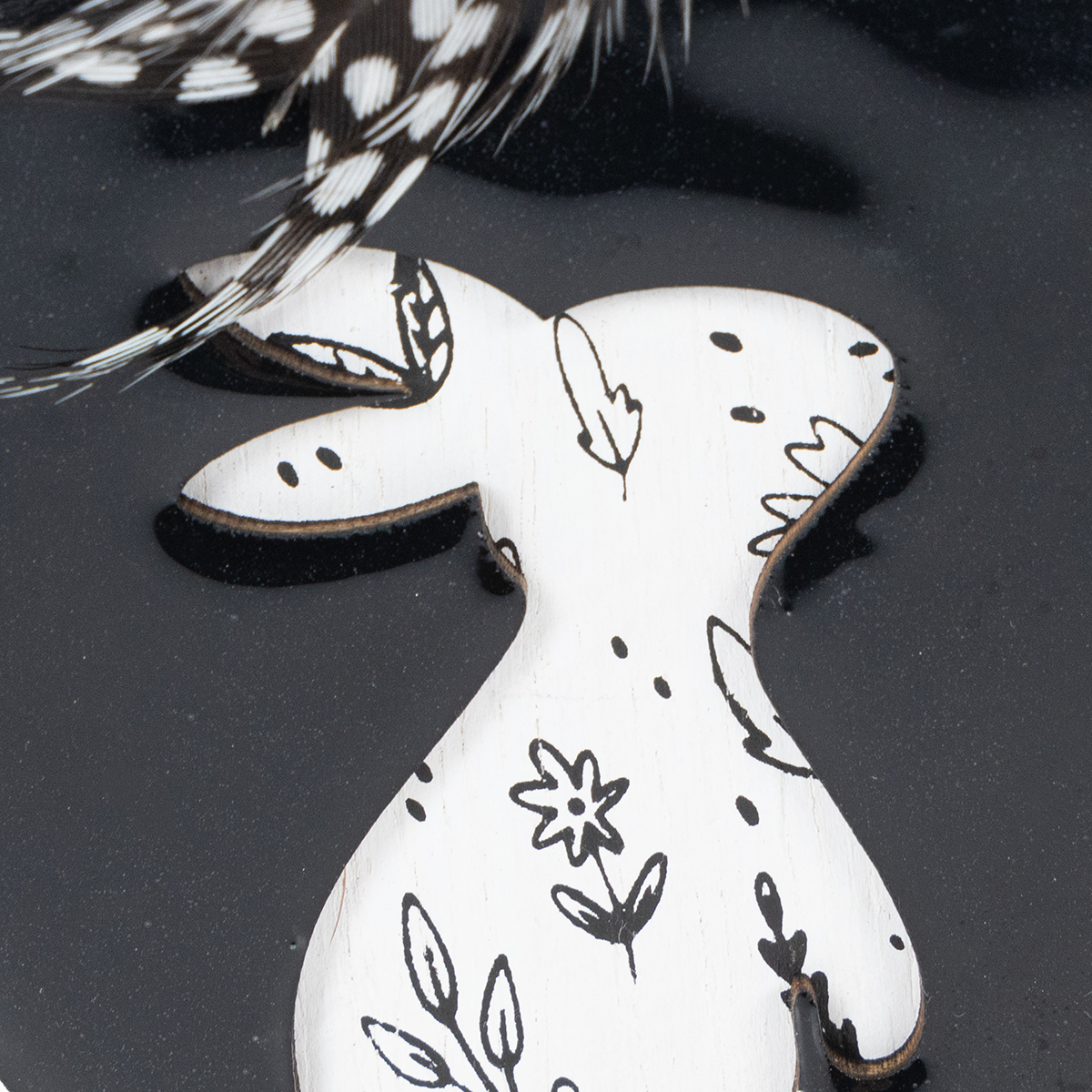 Bílé vejce zobrazuje sedícího králíka s černými květy na přírodním barevném pozadí. Přirozeně zbarvené vajíčko místo toho obklopuje běžícího zajíčka s bílými květy na černém pozadí. Černé vejce naproti tomu rámuje stojícího králíka s černými květy na bílém pozadí.