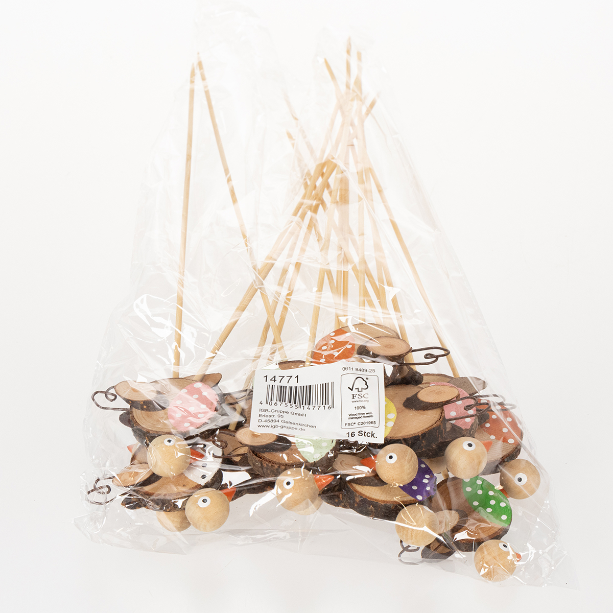 Celkem obdržíte 16 barevných dřevěných kůlů, rozdělených do osmi různých designů. Každý design vytváří svou vlastní harmonickou atmosféru. Živé barvy v kombinaci s přírodním vzhledem dřeva dělají z ptáčků skutečný poutač pozornosti. Ať už jsou aranžováni jednotlivě nebo v kombinaci s jinými dekorativními předměty, jako jsou jarní květiny nebo sezónní věnce, tito malí dřevění ptáčci vypadají skvěle kdekoli. Jsou také fantastickým dárkem pro zahradnické nadšence nebo krásným malým dárkem na zahradní párty!