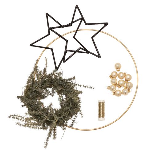 Tato vánoční dekorace na okno se vznáší v ozdobném prstenu jako vánoční pohádka. S touto DIY krabičkou můžete vytvořit moderní vánoční dekorace v černé a zlaté barvě.U této vánoční dekorace na okno hraje hlavní roli kvalitní ozdobný drát. Nechybí zimní umělé květiny a mini vánoční koule ve zlaté barvě. DIY krabička obsahuje vše, co potřebujete k výrobě drátěné závěsné dekorace!