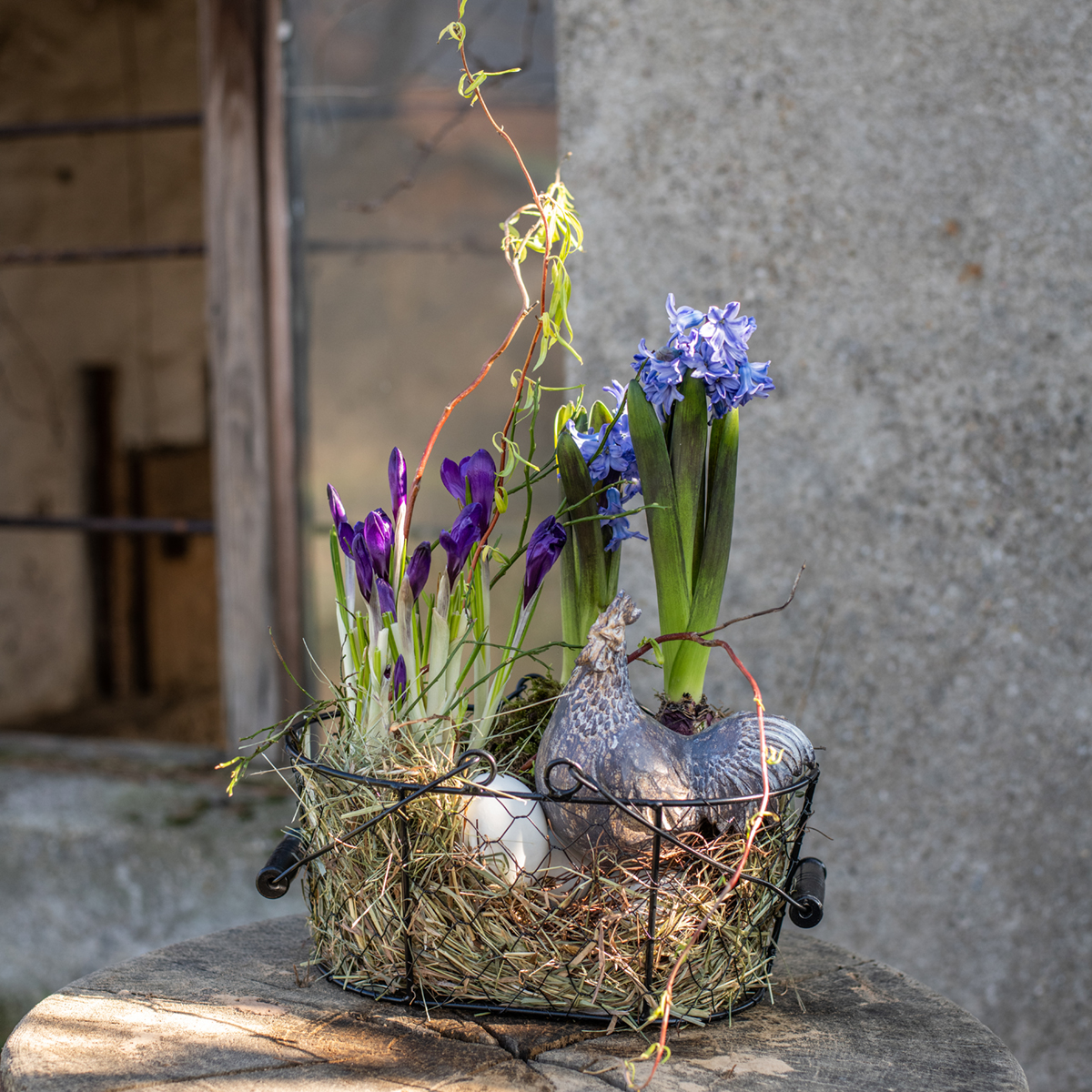 Oválný drátěný košík s uchem měří přibližně 27 x 16,5 centimetru a je vysoký cca 13,5 centimetru. Kovové vzpěry byly nalakovány speciální hnědou barvou, která simuluje zrezivělý povrch a spolu se zdrsněnými úchyty je zcela v souladu s vintage trendem.