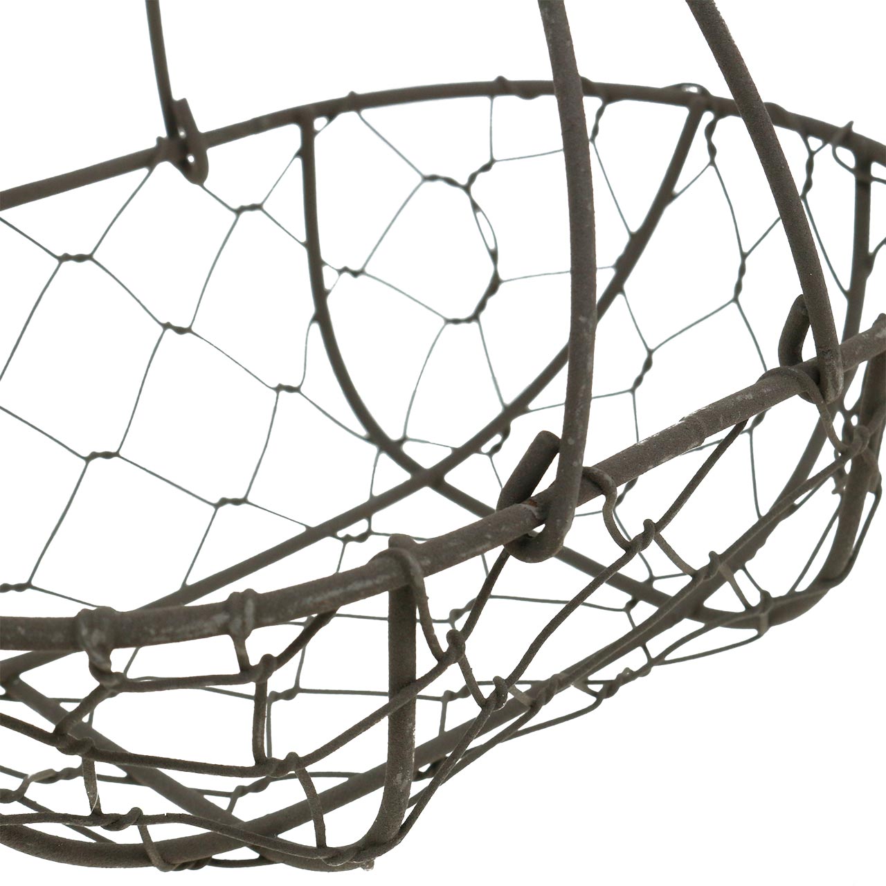 Šedý drátěný koš s tmavě hnědou dřevěnou rukojetí je přibližně 17 centimetrů dlouhý, 11 centimetrů široký a včetně rukojeti vysoký přibližně 15 centimetrů.
