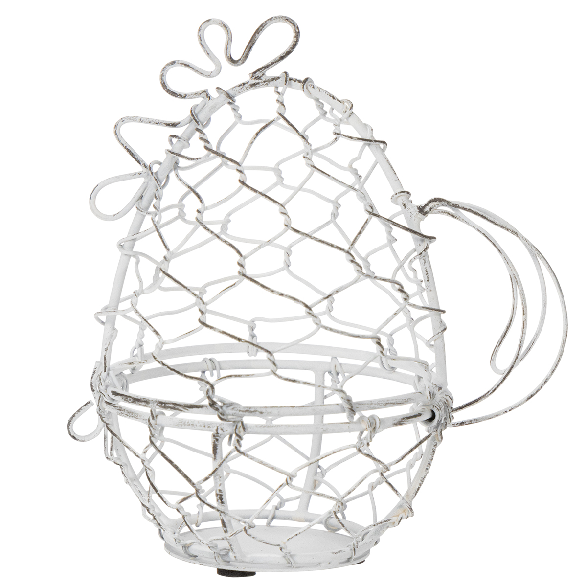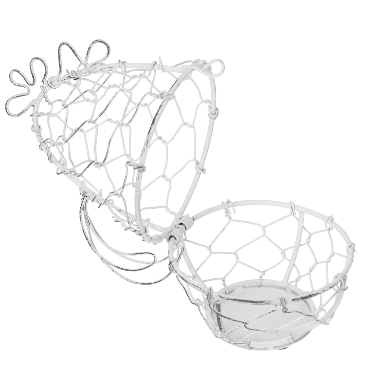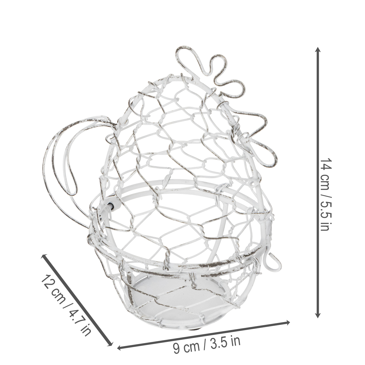 Tento drátěný koš ve tvaru kuřete je nejen poutavý, ale i mimořádně praktický. S výškou 14 cm a průměrem 12 cm je ideální velikostí pro vaše velikonoční vajíčka. Robustní bílá kovová konstrukce zdůrazňuje okouzlující shabby-chic vzhled, který kombinuje decentní eleganci s rustikálním nádechem. Nadčasový design se hodí k různým stylům interiéru, od venkovského a vintage až po moderní.