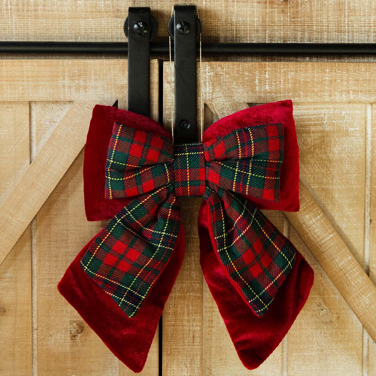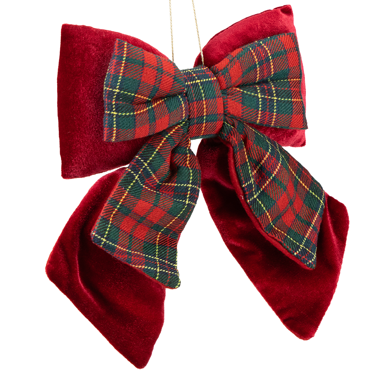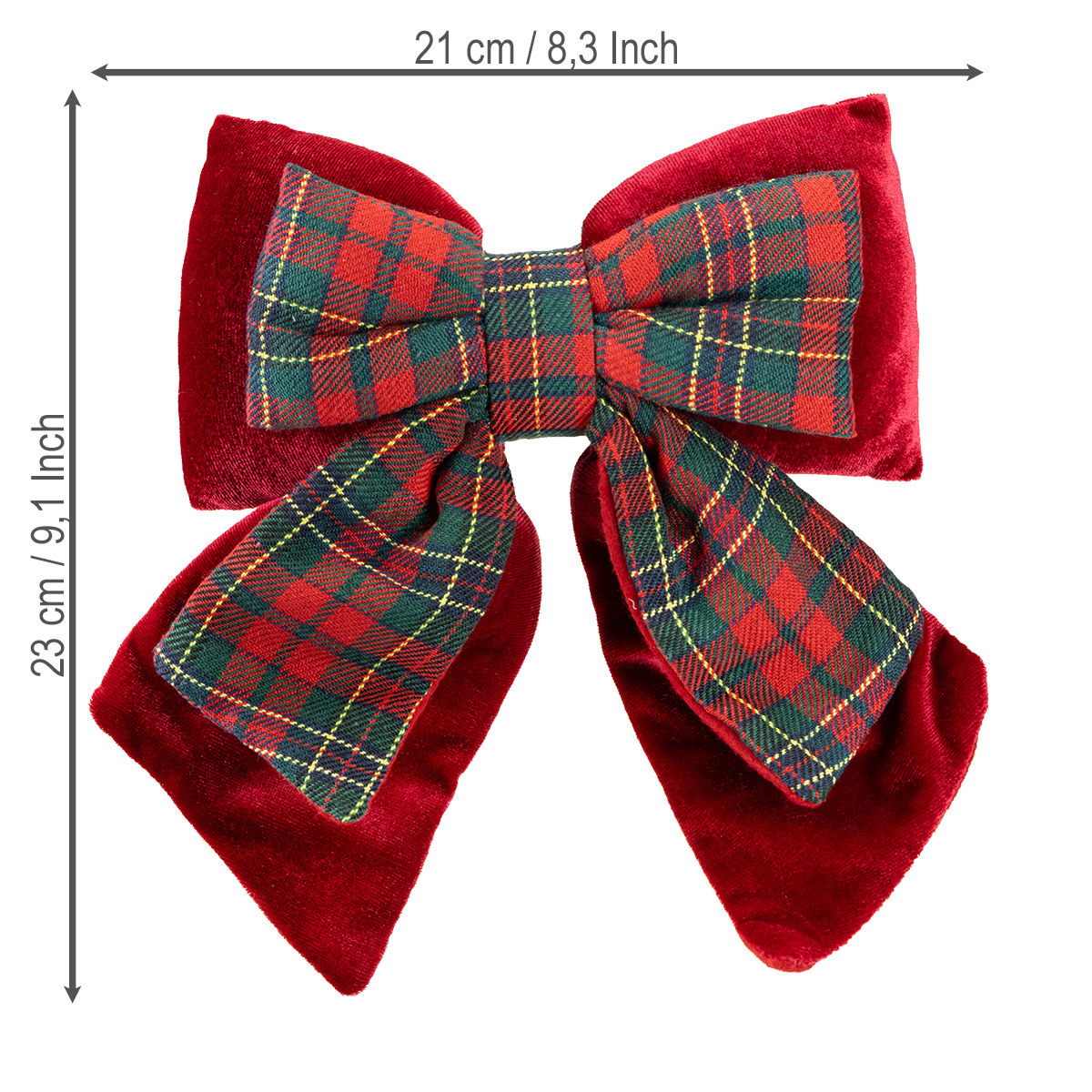 Červená sametová mašle a o něco menší ozdobná mašle se skotským kostkovaným vzorem kombinují estetiku a funkčnost. Zářivá sametová látka se setkává s nadčasovým kostkovaným vzorem a nabízí kontrast klasických vánočních barev a harmonie v jednom. S rozměry přibližně 21 x 23 cm není ani příliš velká, ani příliš malá, přesně tak akorát pro stylový akcent. Vycpaný vnitřek mašle zajišťuje, že zůstane na místě – ať už ji připevníte na věnec, použijete jako dekoraci na dveře nebo s ní ozdobíte stěny a okna.