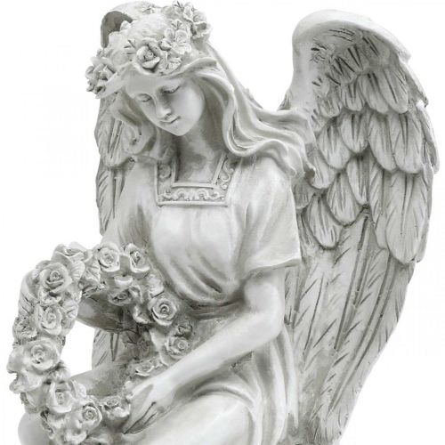 Půvabně truchlící anděl hrob s věncem a rozpuštěnými vlasy sedí u hrobu. Postava anděla je velmi detailně navržena jako ozdoba hrobu a díky velkým, pootevřeným křídlům působí velmi harmonicky. Smuteční anděl je vyroben z polyresinu. Umělý kámen nabízí mnoho výhod. Především lze velmi dobře zobrazit detaily na hrobové postavě. Zároveň je lehký materiál odolný vůči povětrnostním vlivům a mrazu. Hrobový anděl se starožitnou patinou v šedé barvě navíc vypadá jako starožitná hrobová socha z mramoru.Anděl je vkusný nápad, jak natrvalo ozdobit náhrobek nebo urnový hrob. Jako dekorace může figurka anděla sedět vedle mísy s rostlinami, náhrobní svíčky nebo smutečního aranžmá. Hrobová socha činí design hrobu rozmanitějším. Hrobový anděl navíc nabízí vyhlídku, s níž se mohou tiše truchlící příbuzní a přátelé při návštěvě hrobu ztotožnit.
