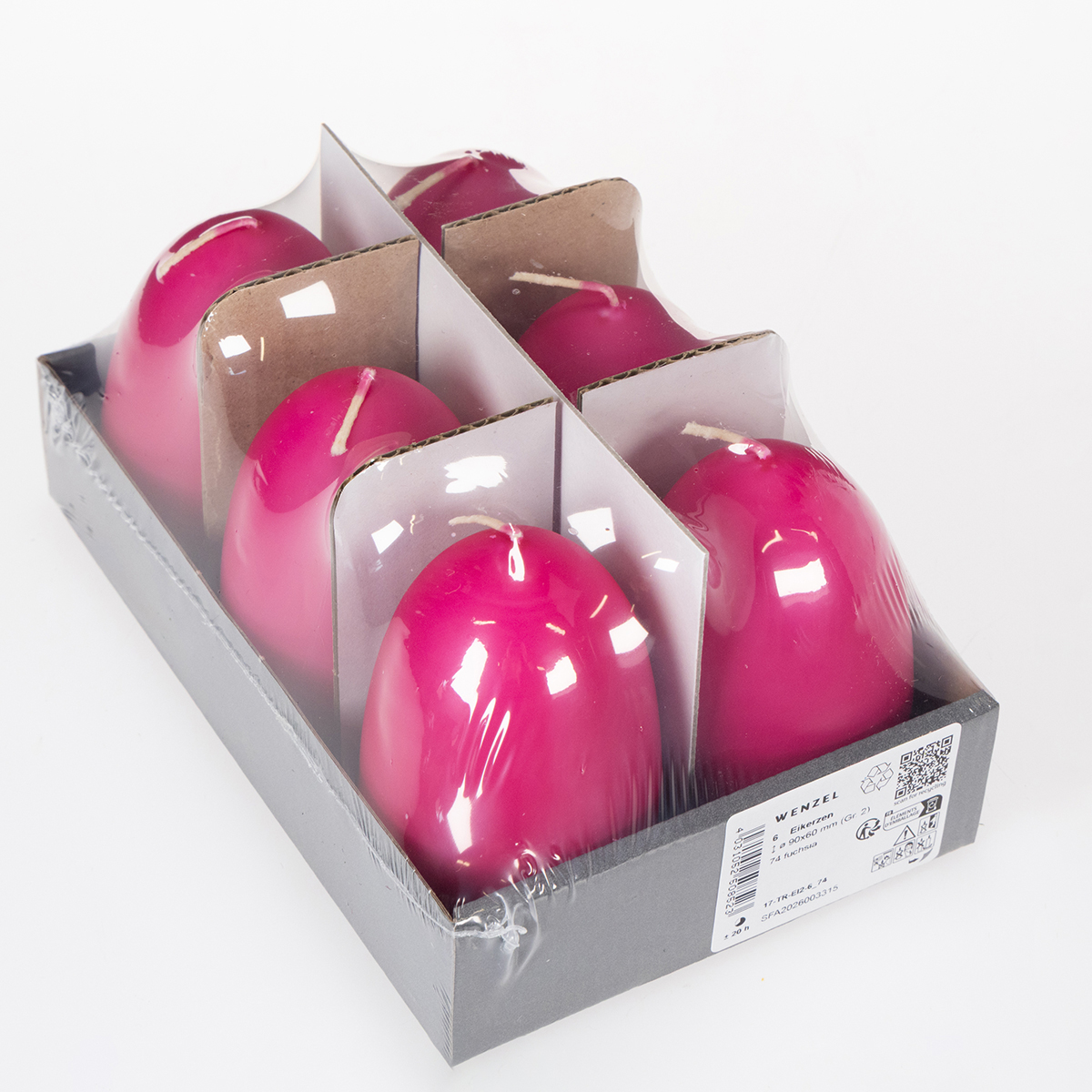 Tato růžová svíčka ve tvaru vajíčka kombinuje svěží barevné akcenty s vysoce kvalitním řemeslným zpracováním. S výškou 9 centimetrů a průměrem 6 centimetrů je perfektním ústředním bodem jarního prostírání. Její teplá záře vytváří přirozenou a útulnou atmosféru, aniž by byla příliš výrazná. Navzdory své zářivé barvě není svíčka celou probarvená. Jemný lesk povrchu jí dodává moderní eleganci, která doplní téměř jakýkoli styl interiéru. Ať už dáváte přednost minimalistickému skandinávskému vzhledu nebo něčemu hravějšímu, tato růžová velikonoční svíčka ve tvaru vajíčka dodá svíčce barevný nádech, aniž by obětovala nadčasovost. Pro obzvláště harmonický vzhled zkombinujte svíčku s pastelově zbarvenými ubrousky, čerstvými květinami, jako jsou hyacinty, nebo malými velikonočními figurkami. Tip: Naše svíčka ve tvaru vajíčka se také krásně hodí ke stříbrným nebo bílým dekorativním prvkům, což vnáší nádech svěžesti do jednodušších aranžmá. Obzvláště praktická funkce: balení obsahuje šest svíček, takže i větší dekorace budou hračkou!