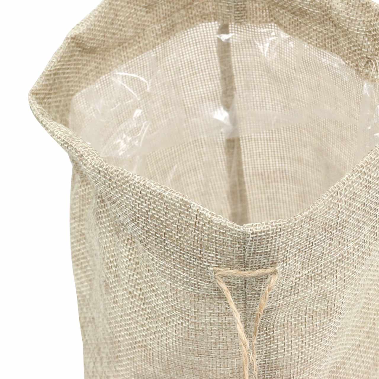 Jutový pytel je jemně tkaný, položený na vrstvě odolné proti roztržení z velmi tenkého plastu a opatřený šňůrkou v přírodních barvách. Vnitřek tašky je navíc vyložený pevnou plastovou fólií, takže se hodí i na květinové dárky nebo třeba jako květináč.