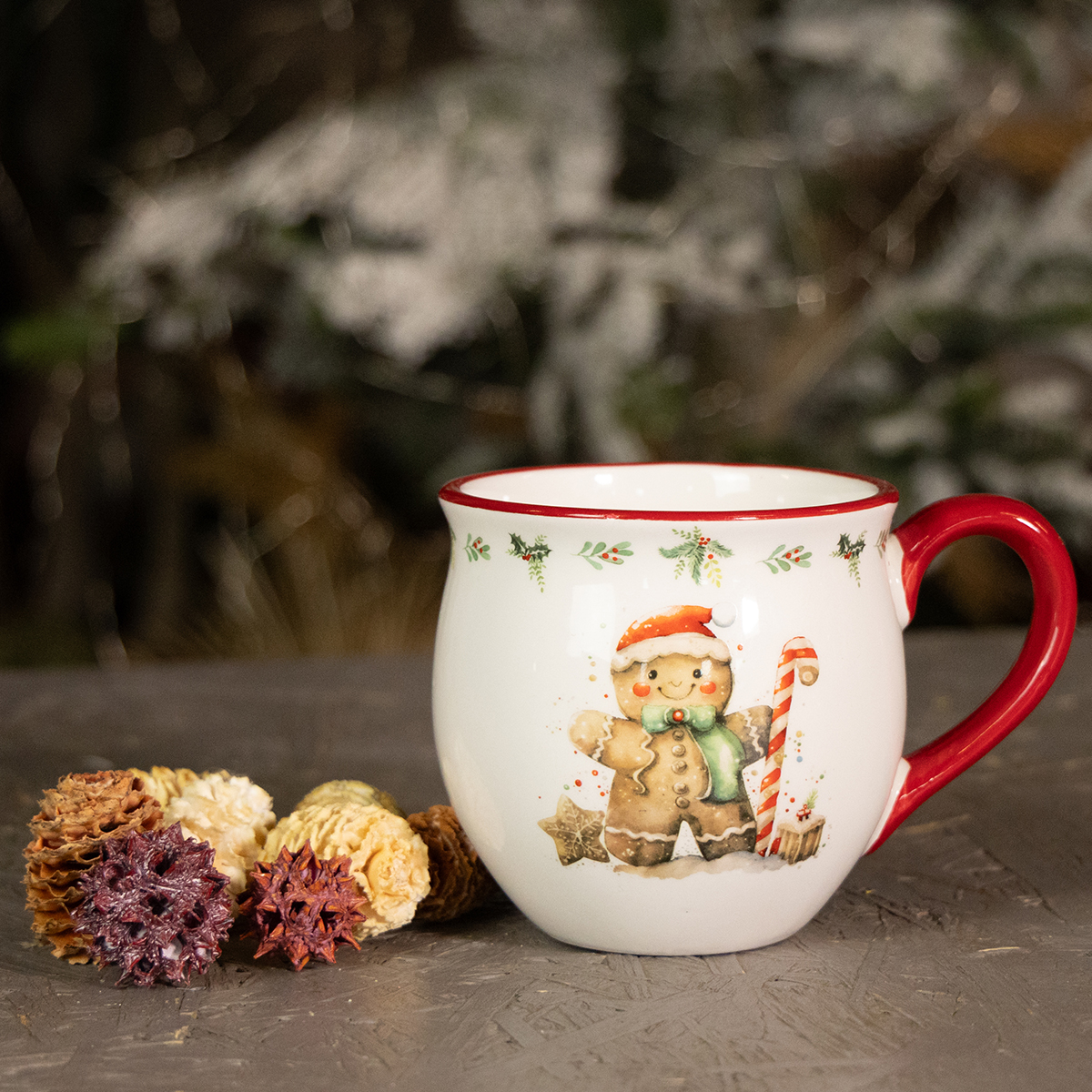 Tento sváteční keramický hrnek zaujme svým pečlivě propracovaným designem v klasickém vánočním stylu. Roztomilý perníkový mužík hravě kombinuje nostalgii s modernou. Červenobílá barevná kombinace a okraj zdobený jmelím úžasně decentním způsobem umocňují vánoční atmosféru.
