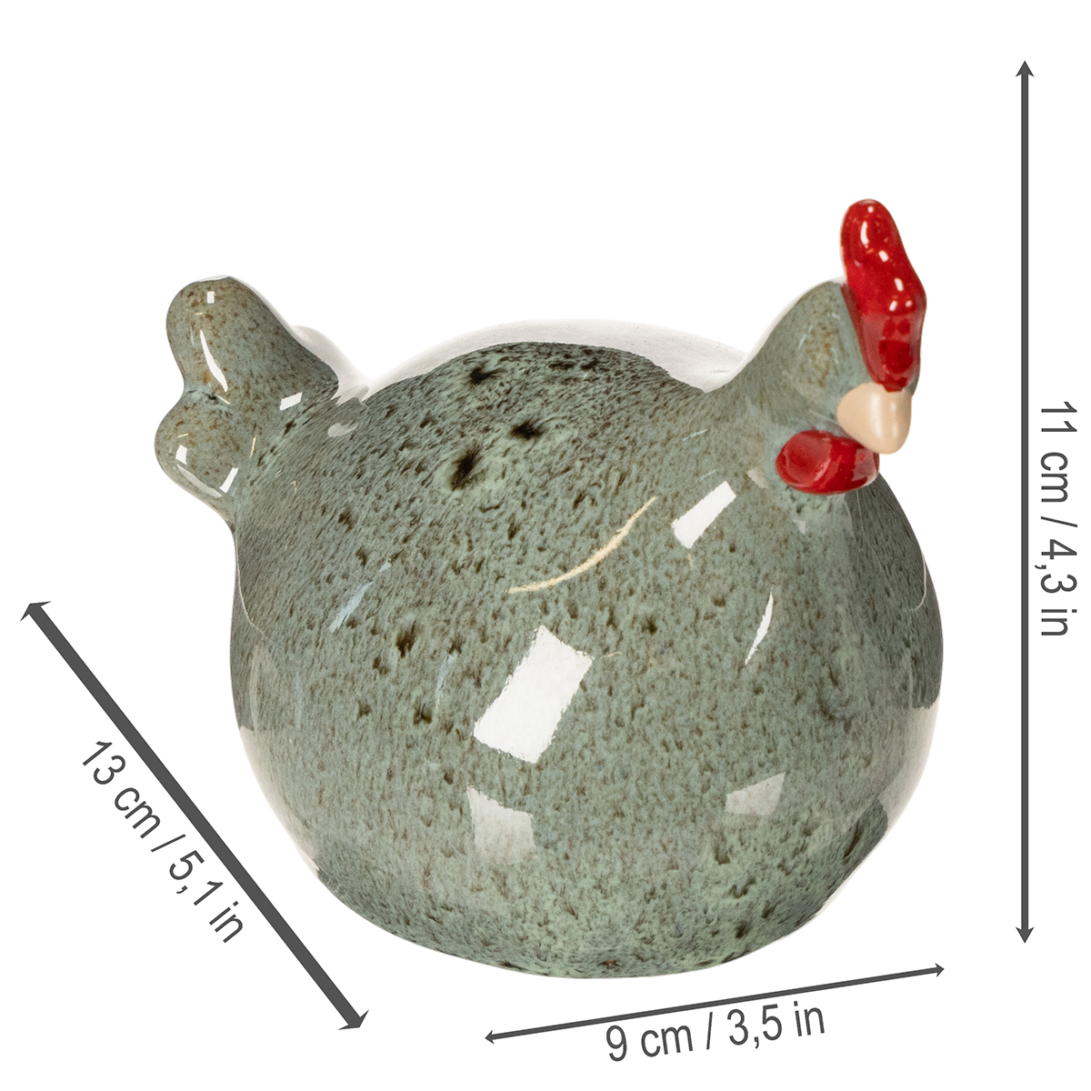 Tato dvě dekorativní kuřata ve veselém zeleném odstínu zaujmou harmonickou kombinací jednoduchých tvarů a rustikálního kouzla. Každá figurka je pečlivě vyrobena z vysoce kvalitní keramiky a má hladký povrch, který krásně zdůrazňuje její jemné zbarvení. S rozměry 13 x 9 x 11 centimetrů se kuřata dokonale hodí do jakéhokoli interiéru. Červené detaily na hřebenech a zobácích dodávají okouzlující a zářivý nádech, který rozzáří každé prostředí.
