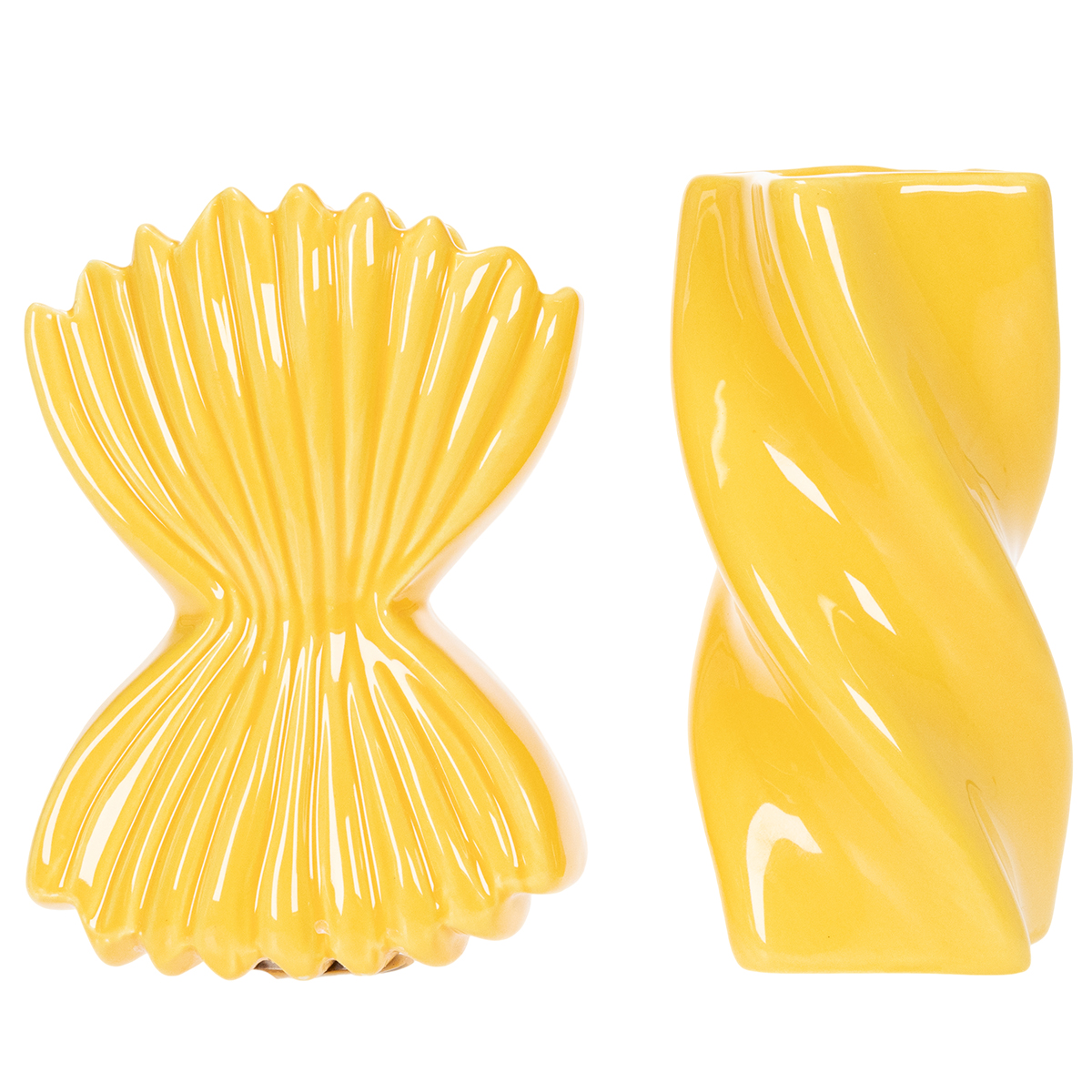 Tyto dekorativní keramické vázy zaujmou na první pohled svým výjimečným designem, inspirovaným hravými tvary oblíbených italských těstovin. Jsou ideální pro milovníky originálních dekorací a moderních designových kousků! Kombinace zářivě žluté barvy a detailního designu dělá z těchto váz stylový doplněk do obytných prostor nebo kanceláří ve středomořském stylu. Pro harmonický celkový vzhled doplňte tyto designové kousky jednoduchým ubrusem nebo dekorací inspirovanou Středomořím.