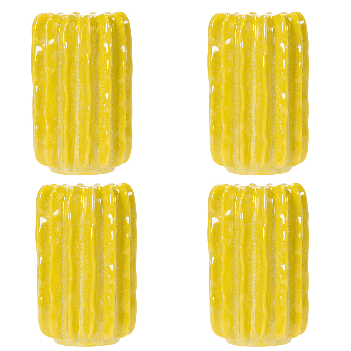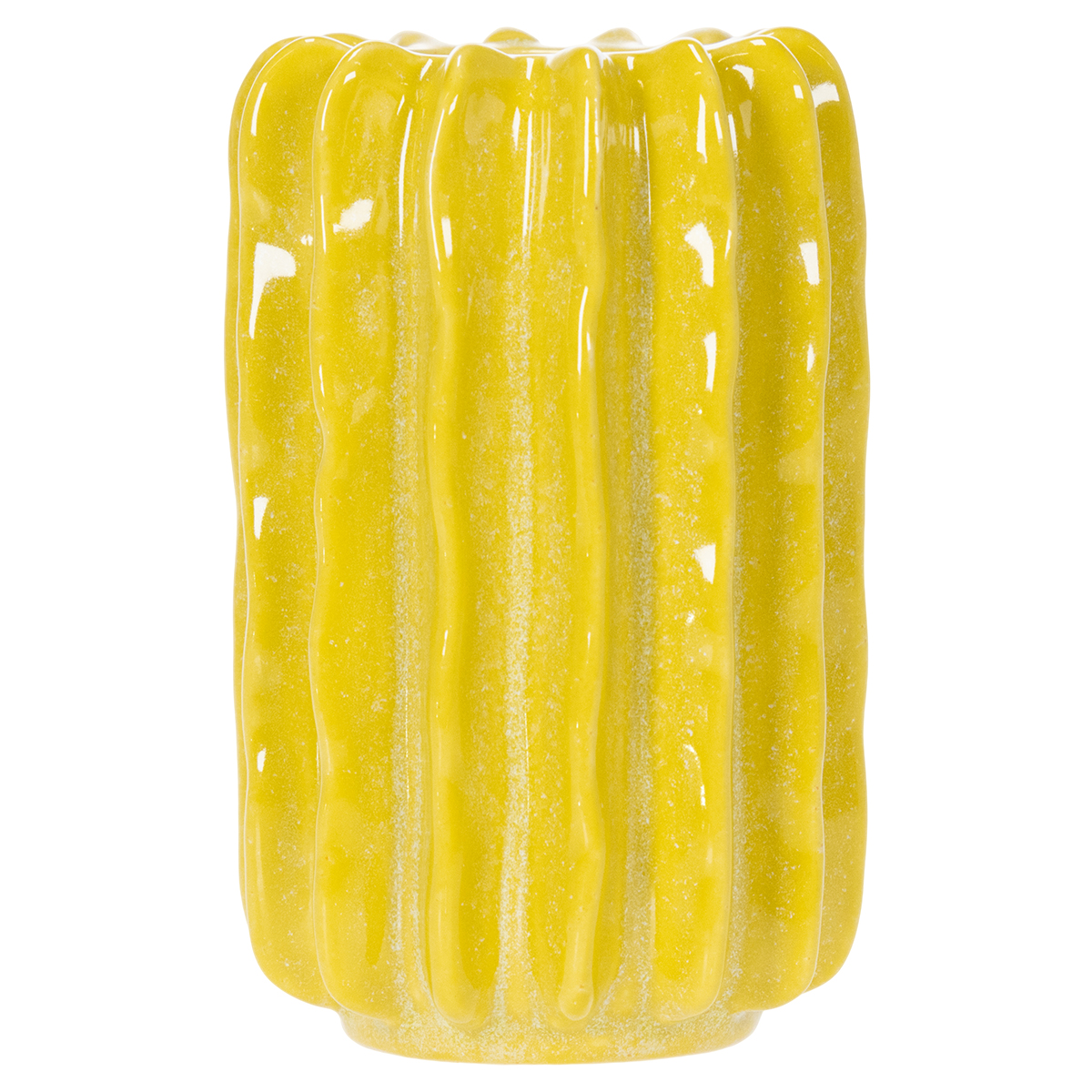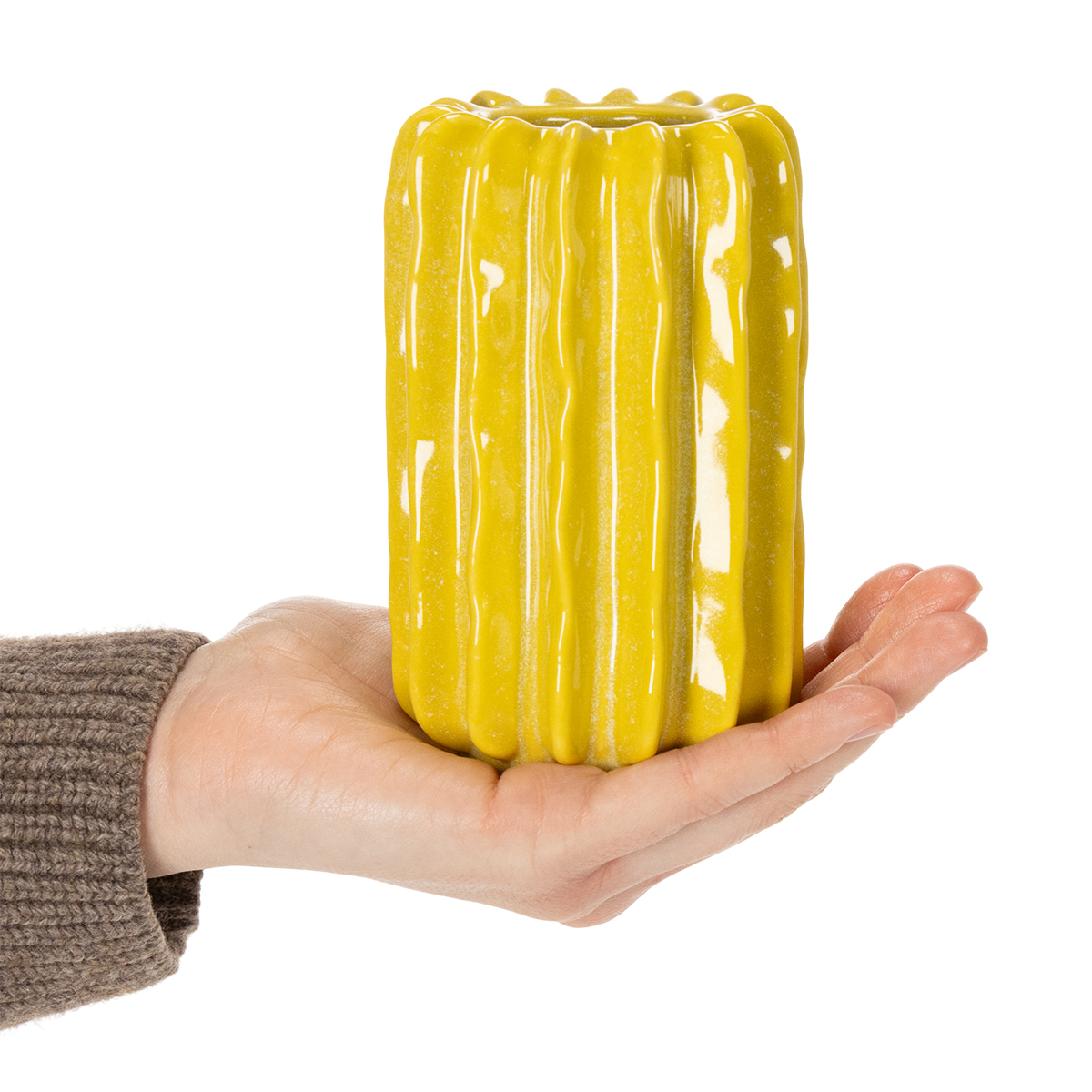 Tato žlutá keramická váza s drážkami šikovně kombinuje formu a funkci. S výškou 13 cm a průměrem 8 cm je ideální volbou pro malé pokojové rostliny, jako jsou sukulenty, nebo pro květinová aranžmá ze sušených květin. Exotický styl tohoto designu evokuje letní pouštní sny a dělá z ní ozdobu každého stolu.